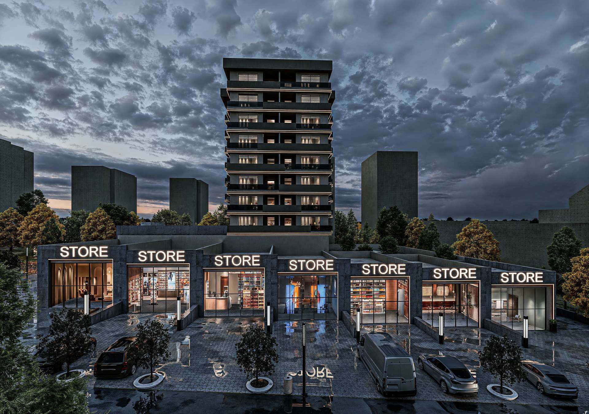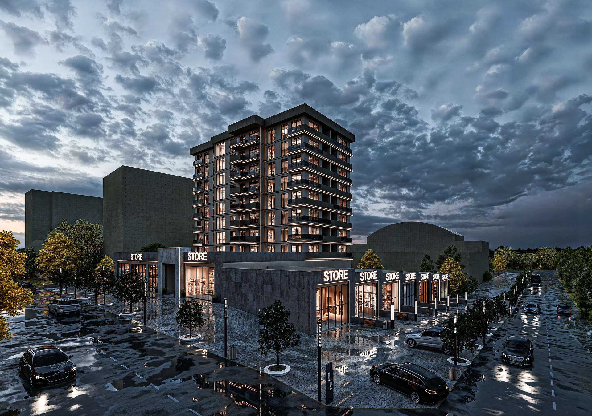 Eryaman’ın kentsel dokusuna dinamik bir soluk getiren bu karma proje, konut ve ticaret fonksiyonlarını modern bir mimari dille tek kütlede buluşturuyor. Tasarımın temelini oluşturan zemin kattaki ticari bazalar (dükkanlar), geniş cam vitrinleriyle sokağa doğrudan entegre olarak mahalleye canlılık ve kentsel bir hareket katmaktadır. Ticari alanların üzerinde yükselen konut kütlesi, cepheyi yatayda kesintisiz saran koyu antrasit kat silmeleri ve şeffaf cam balkonlarla ritmik, dengeli bir silüet oluşturur. Toprak tonlarındaki sıcak dış cephe ile modern koyu detayların yarattığı estetik tezat yapıya prestijli bir karakter kazandırır. İşlevselliğin merkeze alındığı bu tasarım, kullanıcılarına hem sosyal hem de konforlu bir kent yaşamı vadetmektedir.