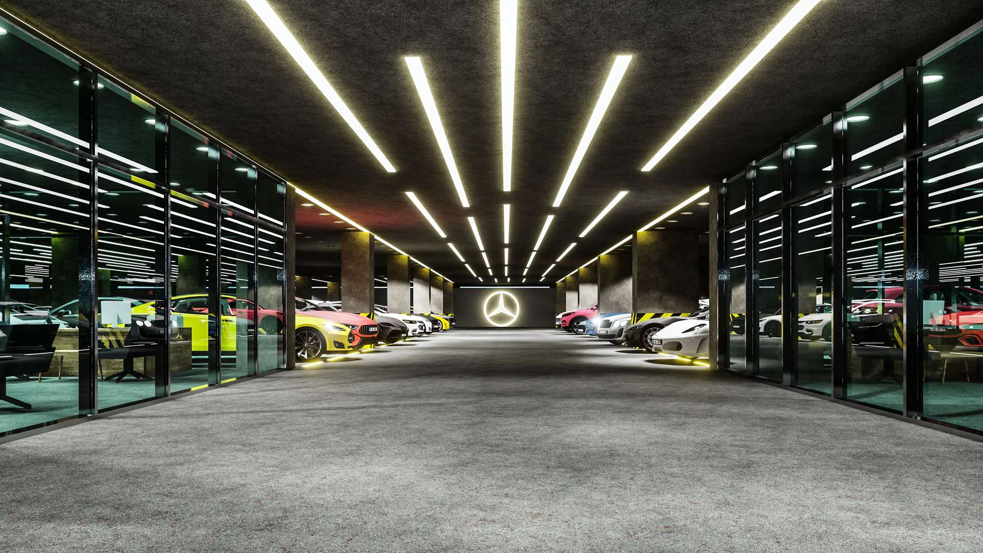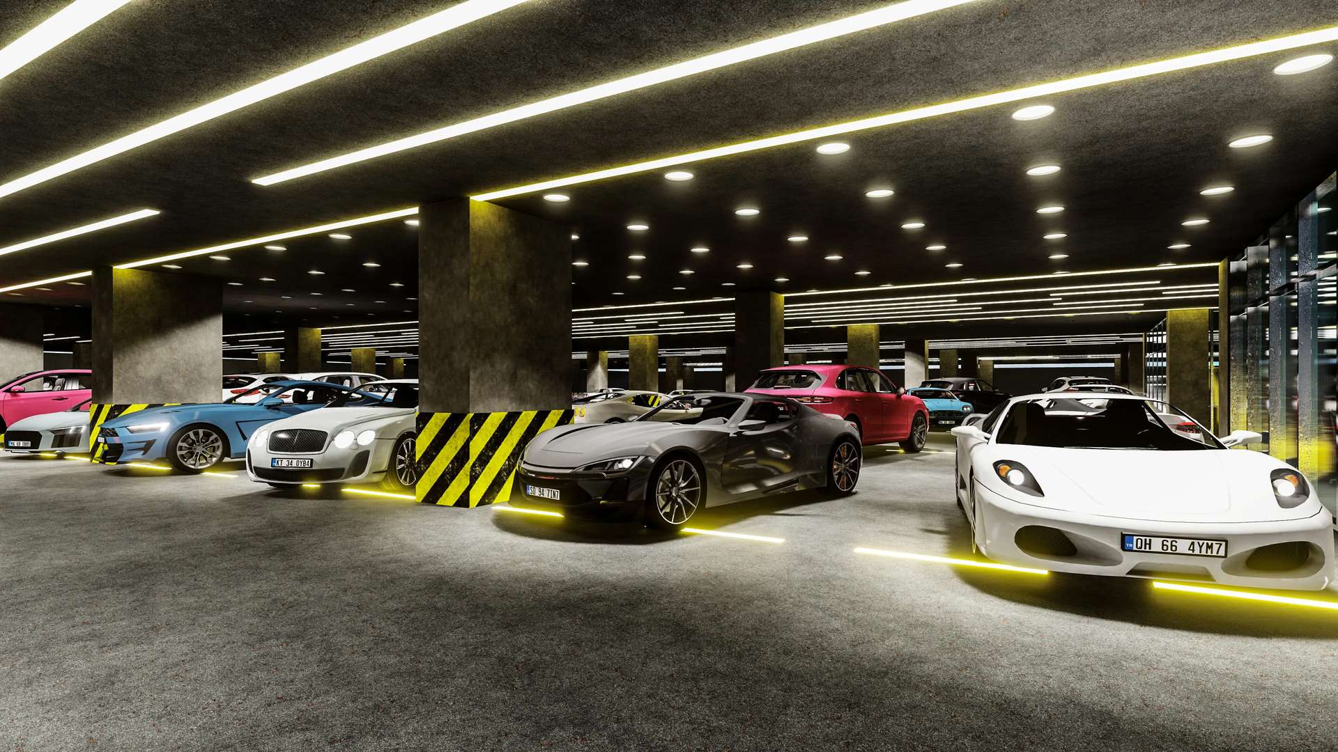 Otomotiv sektörü için özel olarak tasarlanan bu kapalı otopark ve galeri projesi, klasik bir park alanının ötesine geçerek araçlar için prestijli bir sergileme merkezi sunuyor. Brüt beton kolonlar ve koyu renkli yüzeylerin hakim olduğu endüstriyel tasarım, tavanda ve zeminde ritmik olarak uzanan lineer LED aydınlatmalarla vurgulanarak mekana dinamik, modern ve lüks bir atmosfer kazandırıyor. Zemine entegre edilen ışıklı şeritler, park alanlarını estetik bir dille tanımlarken araç sirkülasyonunu da yönlendiriyor. Galerilere özel olarak ayrılmış geniş ve aydınlık camekanlı sergileme alanları (showroomlar), markaların kurumsal kimliklerini ön plana çıkarıyor. Fonksiyonelliği yüksek standartlı bir estetikle harmanlayan bu proje, kullanıcılarına ve ziyaretçilerine üst düzey bir deneyim vadetmektedir.