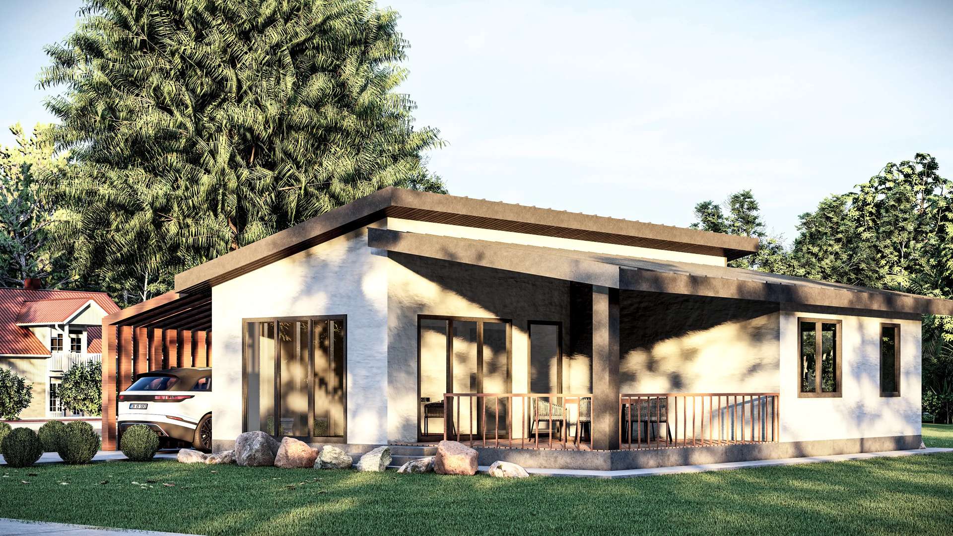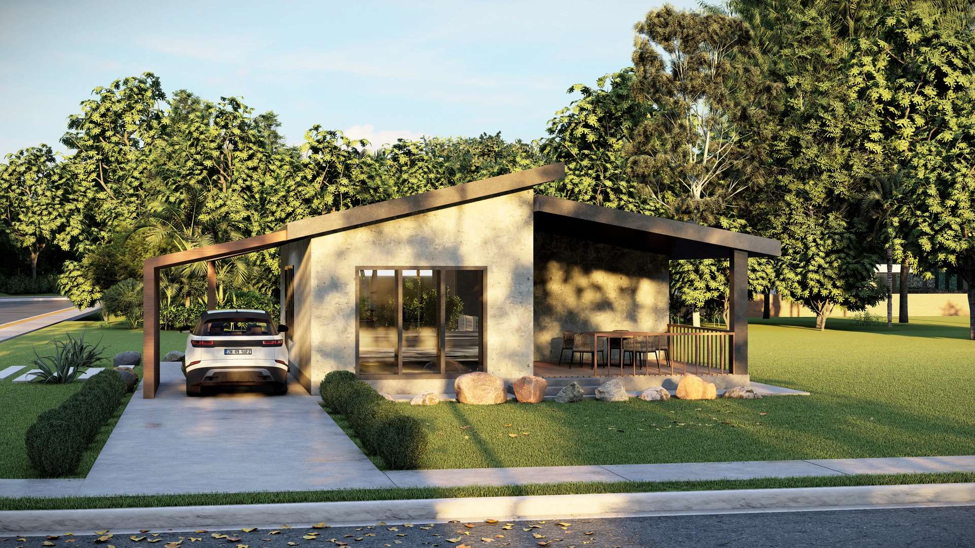 Minimalist yaşam tarzını dinamik bir kütle kurgusuyla yeniden yorumlayan hafif çelik yapı, yenilikçi formu ve fonksiyonel detaylarıyla öne çıkıyor. Tasarımın ana karakterini oluşturan tek yöne eğimli (asimetrik) çatı sistemi, yapıya çağdaş bir silüet kazandırırken iç mekanda ferah bir hacim hissi yaratmaktadır. Brüt beton görünümlü cephe yüzeyleri ve antrasit kenet çatının yarattığı endüstriyel netlik; yan cepheye entegre edilen ve dikey sıcak tonlu panellerle tanımlanan yarı açık otopark (carport) ile estetik bir şekilde dengelenmiştir. Geniş cam açıklıklarla verandaya bağlanan yaşama alanı sayesinde bu proje, kompakt ölçeğine rağmen doğayla iç içe, ferah ve prestijli bir müstakil yaşam deneyimi sunmaktadır.