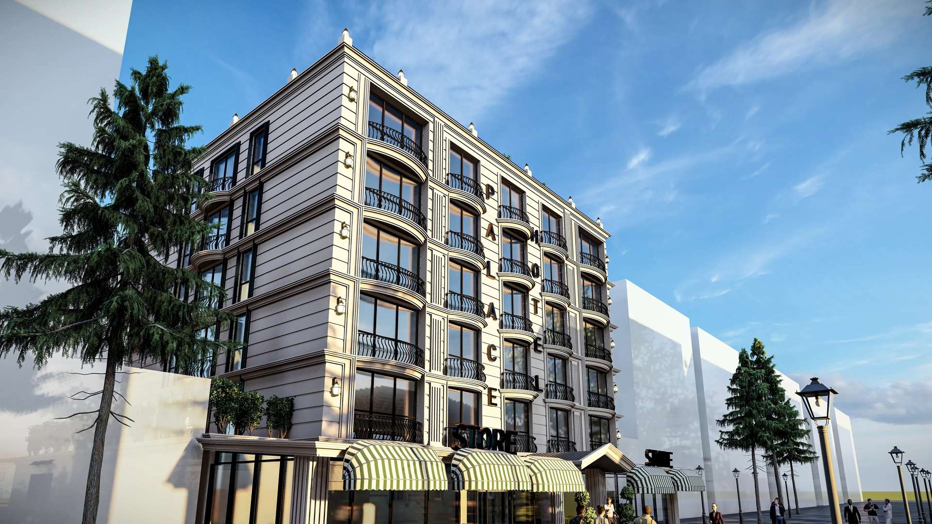 Kızılay'da konumlanan Palas Otel projesi, kentin dinamik dokusuna neoklasik mimarinin zamansız zarafetiyle değer katıyor. Simetrik ve anıtsal bir kütle kurgusuna sahip olan yapı, dikeyde yükselen klasik pilaster formlu silmeleri ve belirgin kat katmanlarıyla güçlü, prestijli bir duruş sergiliyor. Cepheyi ritmik bir şekilde bölen geniş cam yüzeyler ve ferforje detaylı zarif Fransız balkonlar, klasik oranları modern konforla buluşturarak iç mekanlara maksimum gün ışığı ve ferahlık kazandırır. Zemin katta yer alan ve şık çizgili tentelerle tanımlanan ticari birimler sokağın enerjisine doğrudan uyum sağlarken, çatı terası misafirlere izole bir dinlenme alanı sunar. Geleneksel estetiği çağdaş otelcilik anlayışıyla harmanlayan bu tasarım, kullanıcılarına ayrıcalıklı bir konaklama deneyimi vadetmektedir.