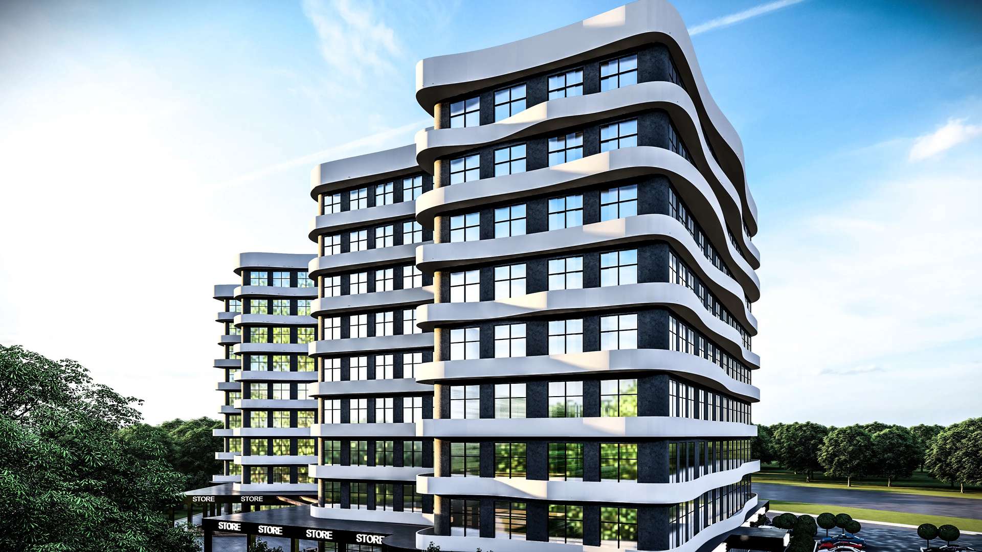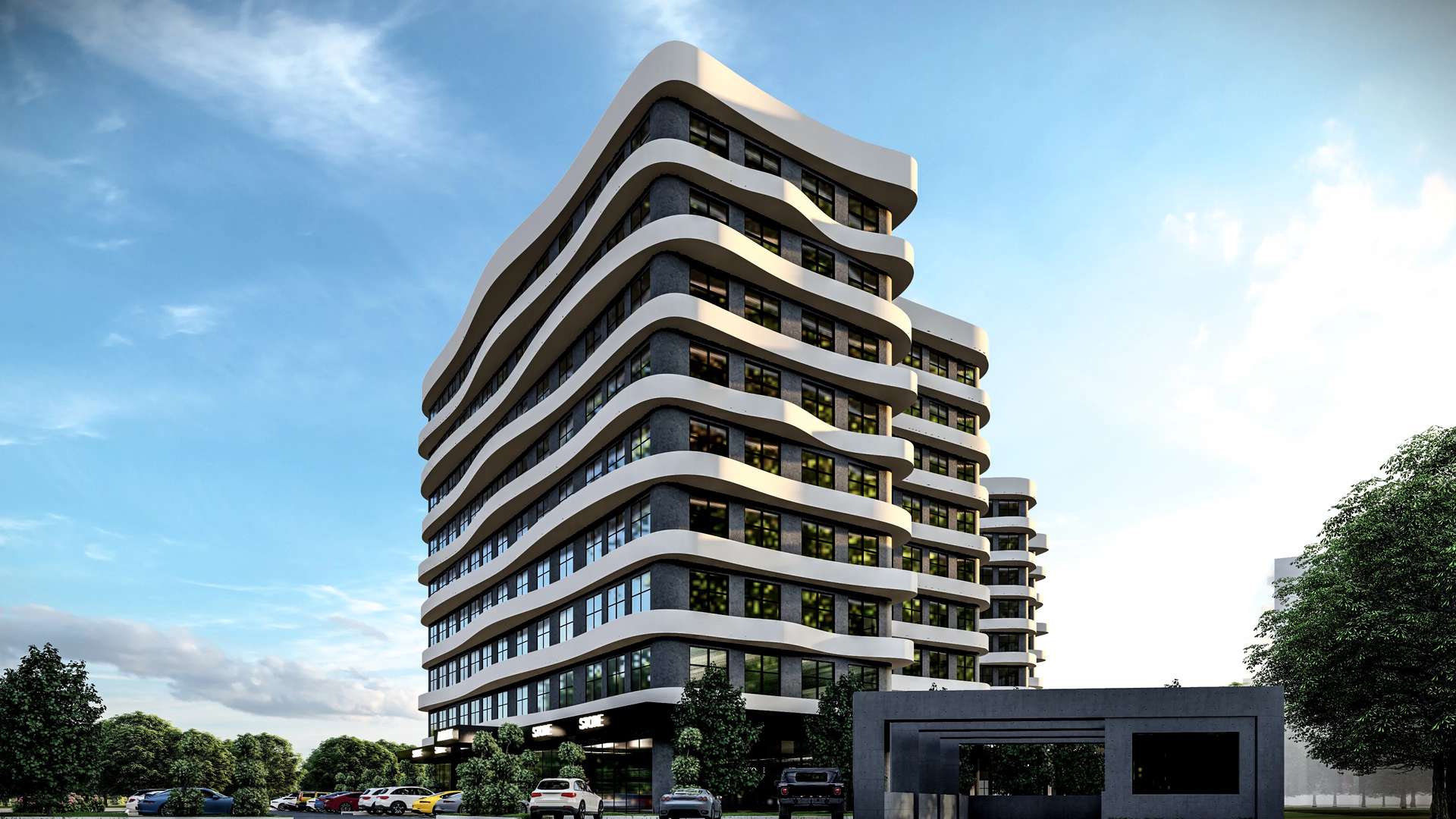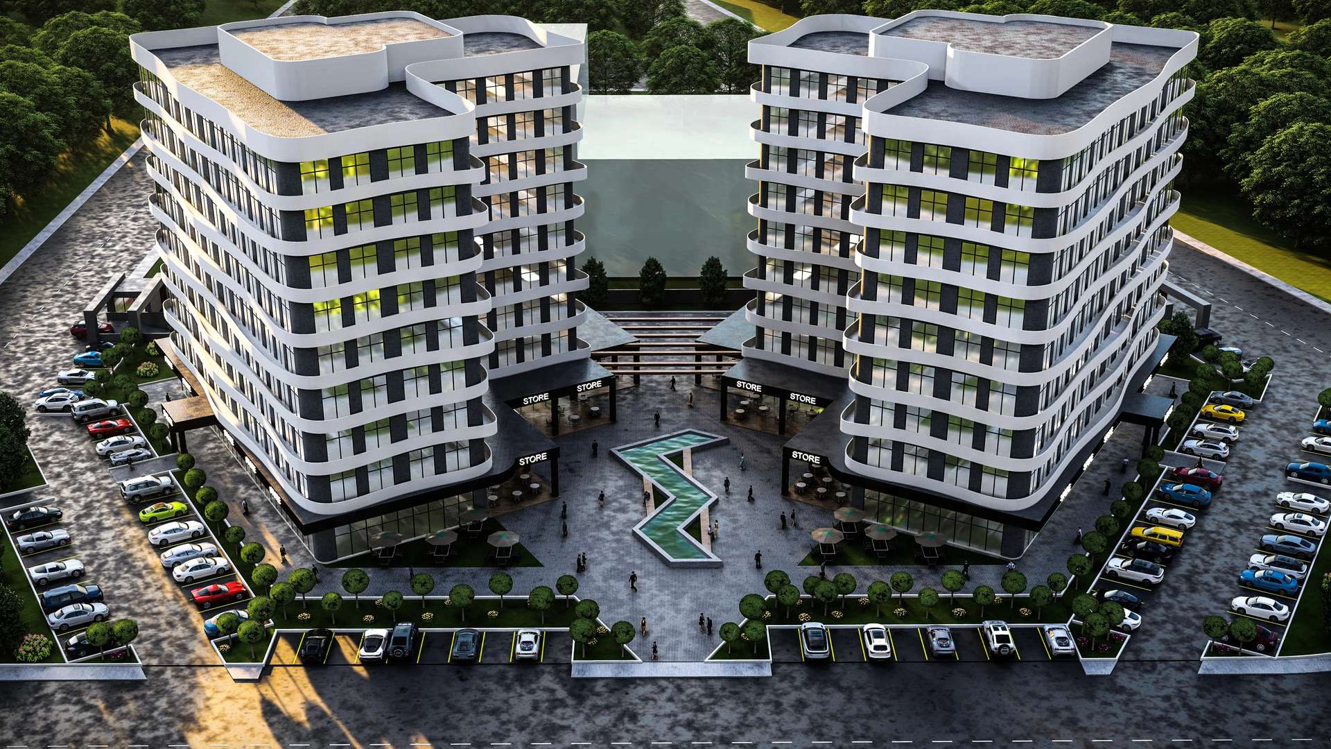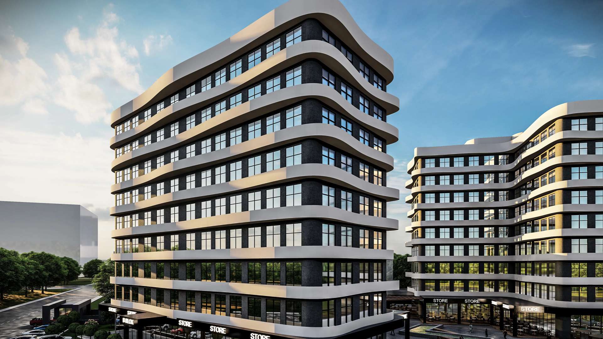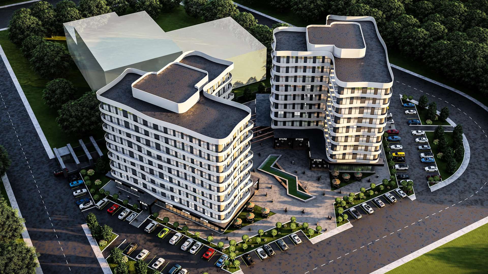 Ticari ve ofis fonksiyonlarını modern bir mimari dille birleştiren Lodumu İş Merkezi, kullanıcı odaklı ve dinamik bir kütle kurgusuna sahiptir. Cephe boyunca uzanan dalgalı beyaz yatay bantlar, geniş cam yüzeylerle güçlü bir kontrast yaratarak yapıya heykelsi bir akıcılık kazandırır. İki ofis bloğunun merkezinde kurgulanan açık avlu, geometrik su öğesi ve zemin kattaki ticari birimlerle desteklenerek nefes alan bir toplanma alanı oluşturur. Sokağı içeri davet eden geçirgen zemin katı ve rasyonel planlamasıyla proje, kentin ticari yaşamına prestijli ve yenilikçi bir odak noktası sunmaktadır.