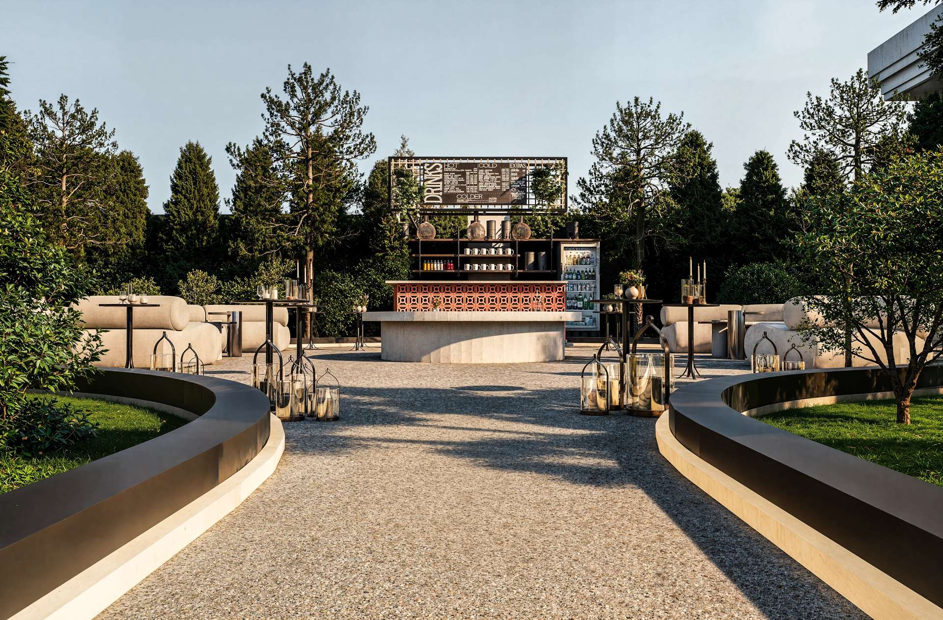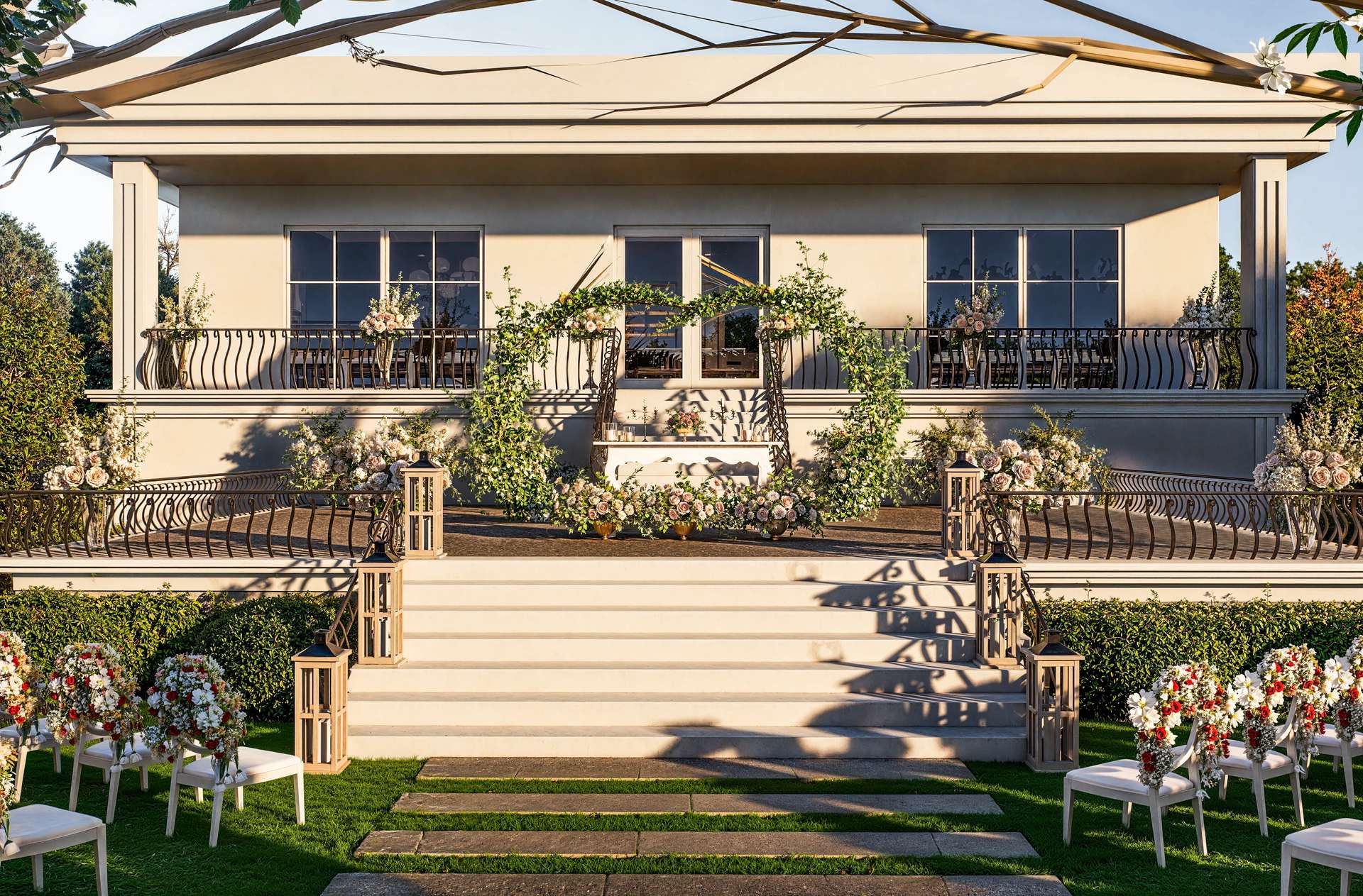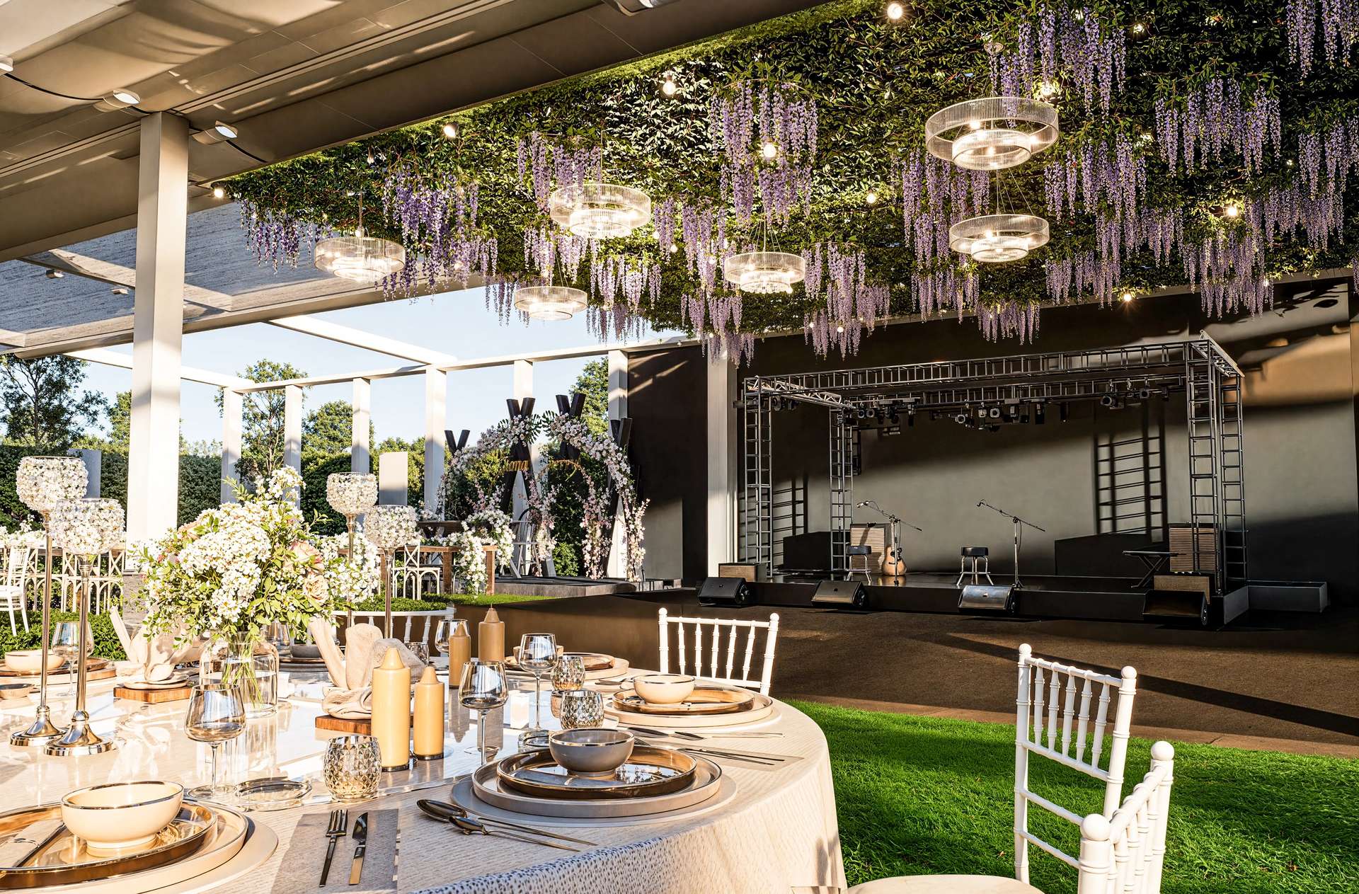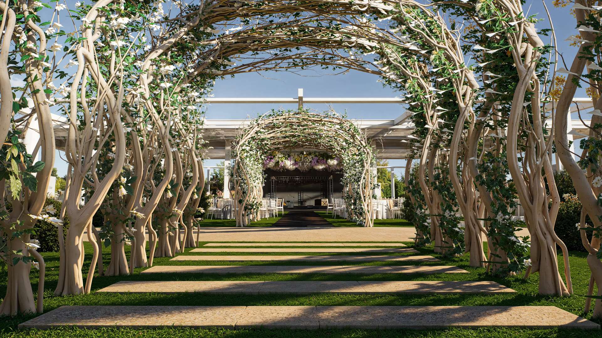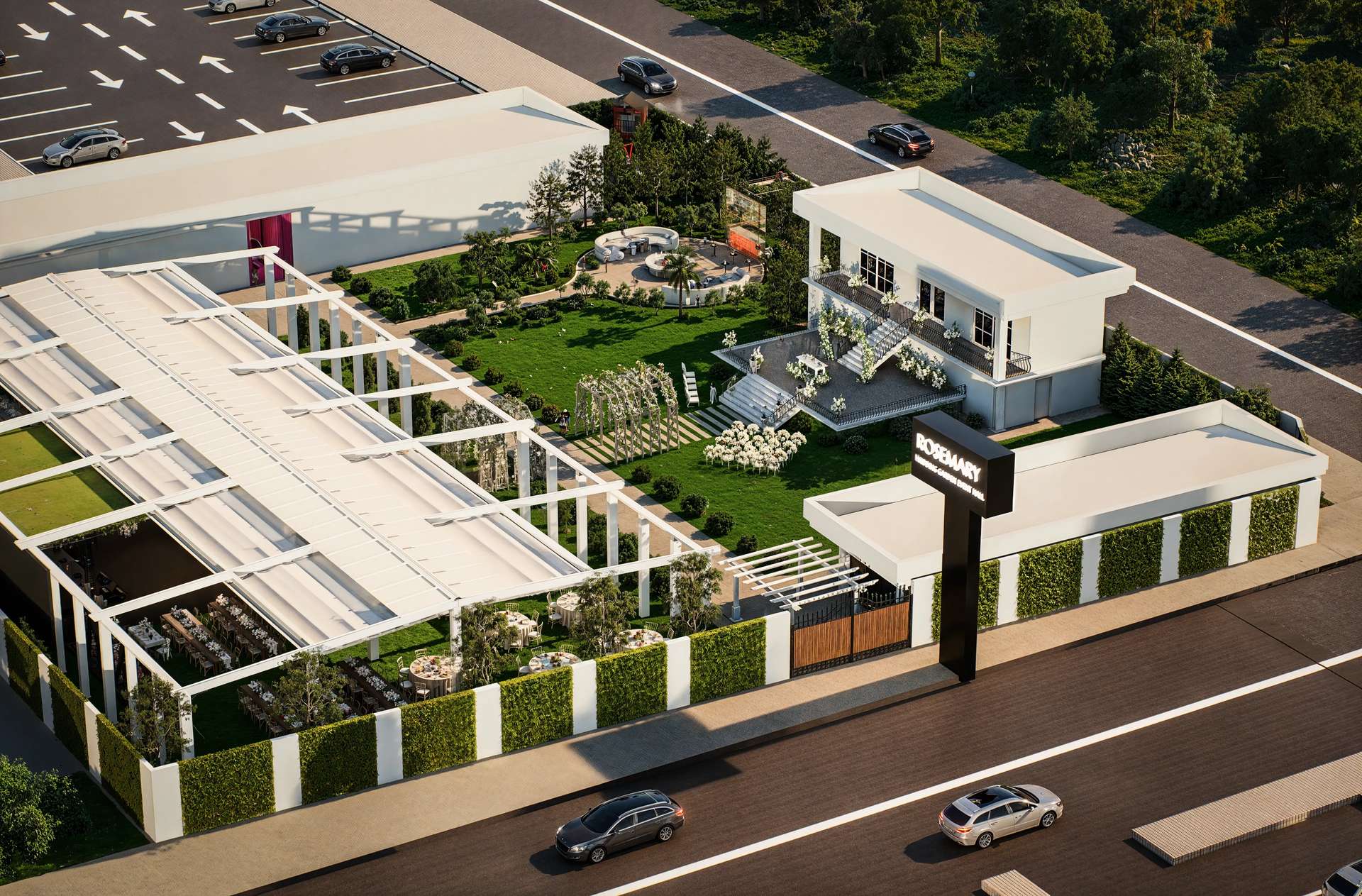 Gölbaşı’nın doğal güzellikleriyle bütünleşen Rosemary Garden Wedding Hall, açık hava etkinlik alanlarını neoklasik mimarinin zarafetiyle yeniden tanımlıyor. Tasarımın odak noktasında yer alan ana yapı, beyaz renkli pürüzsüz cephesi, klasik kolonları ve zarif ferforje detaylarıyla kutlamalara prestijli bir arka plan sunmaktadır. Geniş teras kurgusu, mekanı çevreleyen özenli peyzaj ve heykelsi ağaçlarla kusursuz bir görsel uyum yakalar. Yarı açık davet alanı ise modern çatı örtüsü ve beyaz yapısal iskeletiyle doğayla iç içe, ferah bir atmosfer yaratır. Tavanı süsleyen şık avizeler ve sarkan bitki detayları, rasyonel mimari hatlara romantik bir dokunuş katmaktadır. Fonksiyonelliği lüksle harmanlayan bu proje, misafirlerine Gölbaşı'nda unutulmaz ve seçkin bir organizasyon deneyimi vadetmektedir.