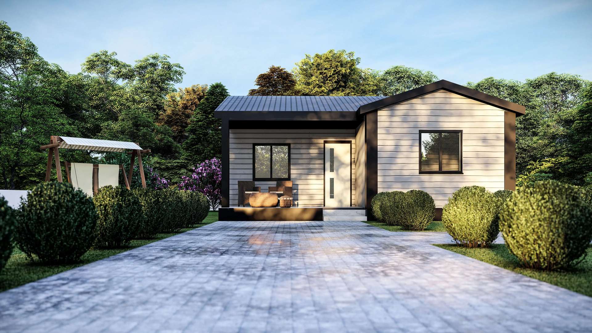 Kırsal mimarinin nostaljik "barn" (ahır/çiftlik evi) formunu modern bir mikro yaşam alanına dönüştüren "Tip 7", karakteristik çatı kurgusuyla öne çıkıyor. Tasarımın ana karakterini; yapıya ekstra iç hacim ve özgün bir silüet kazandıran koyu antrasit kenetli metal çatı ile cepheyi saran yatay ahşap kaplamaların sıcak uyumu oluşturmaktadır. Geniş sürgülü cam yüzeyler ve net doğrama hatları iç mekana modern bir ferahlık katarken, yan cepheye entegre edilen zarif ahşap pergola detayı dış mekan kullanımını estetik bir şekilde zenginleştirir. Geleneksel kırsal çizgileri çağdaş minimalizmle harmanlayan bu tasarım, kullanıcılarına doğanın kalbinde sıcak, konforlu ve karakteristik bir mikro yaşam deneyimi vadetmektedir.