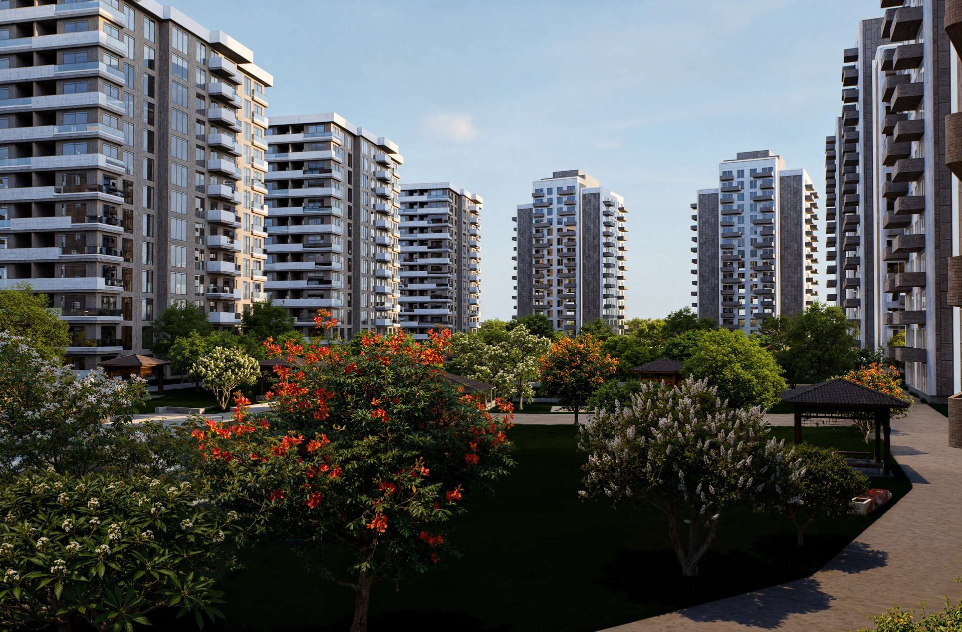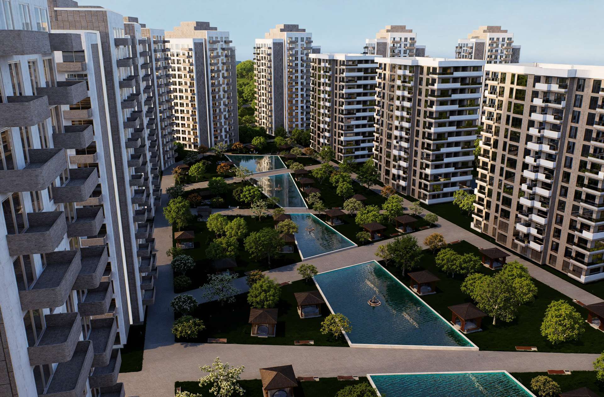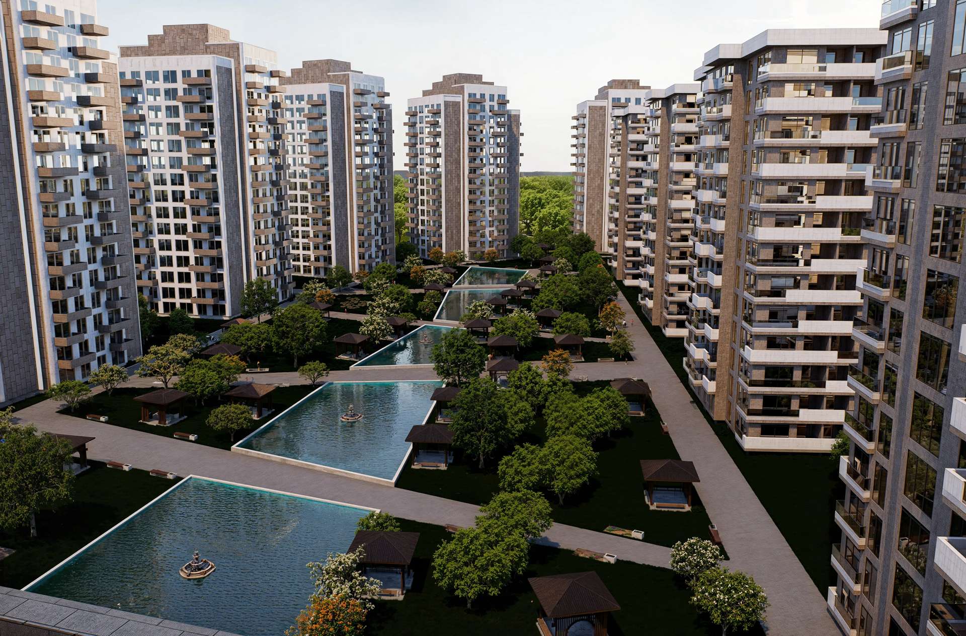Geniş ölçekli bir konut projesi olarak tasarlanan Varlık Sitesi, yüksek katlı blokların kent ölçeğindeki ritmini zengin bir peyzaj kurgusuyla dengeliyor. Birbiriyle uyumlu rasyonel kütleler dikeyde yükselirken; cephedeki hareketli balkon çıkmaları ve dokulu yüzey kontrastları kulelere monotonluktan uzak, dinamik bir silüet kazandırıyor. Projenin kalbinde yer alan ve bloklar tarafından korunaklı bir çanak gibi sarılan geniş iç avlu, tasarımın ana odak noktasını oluşturmaktadır. Uzun akslar boyunca uzanan yansıma havuzları, simetrik peyzaj ögeleri ve ahşap pergolalar, sakinlerine şehrin içinde nefes alan dingin bir mikro-kent ortamı sunar. Yapısal yoğunluğu suyun ve doğanın dinginliğiyle harmanlayan proje, bölgesinde güçlü ve prestijli bir yaşam merkezi vadetmektedir.