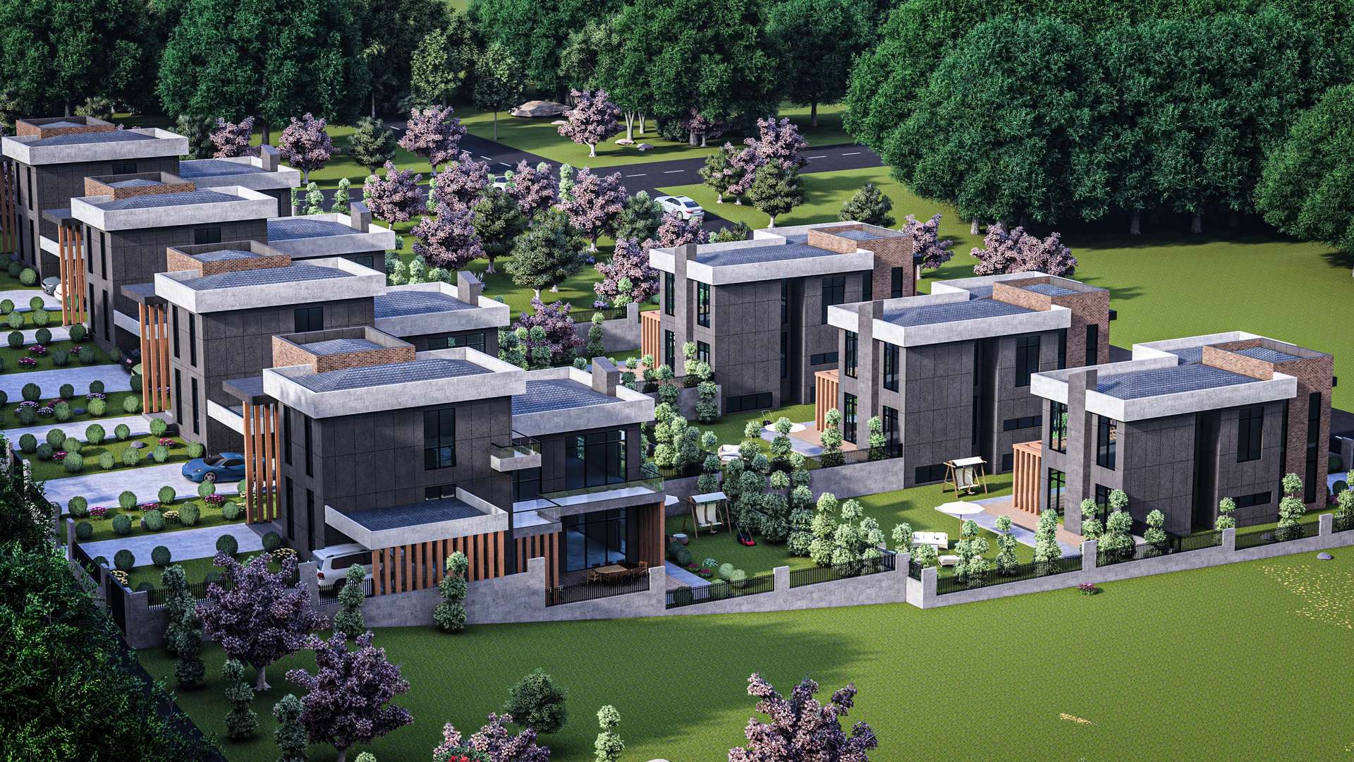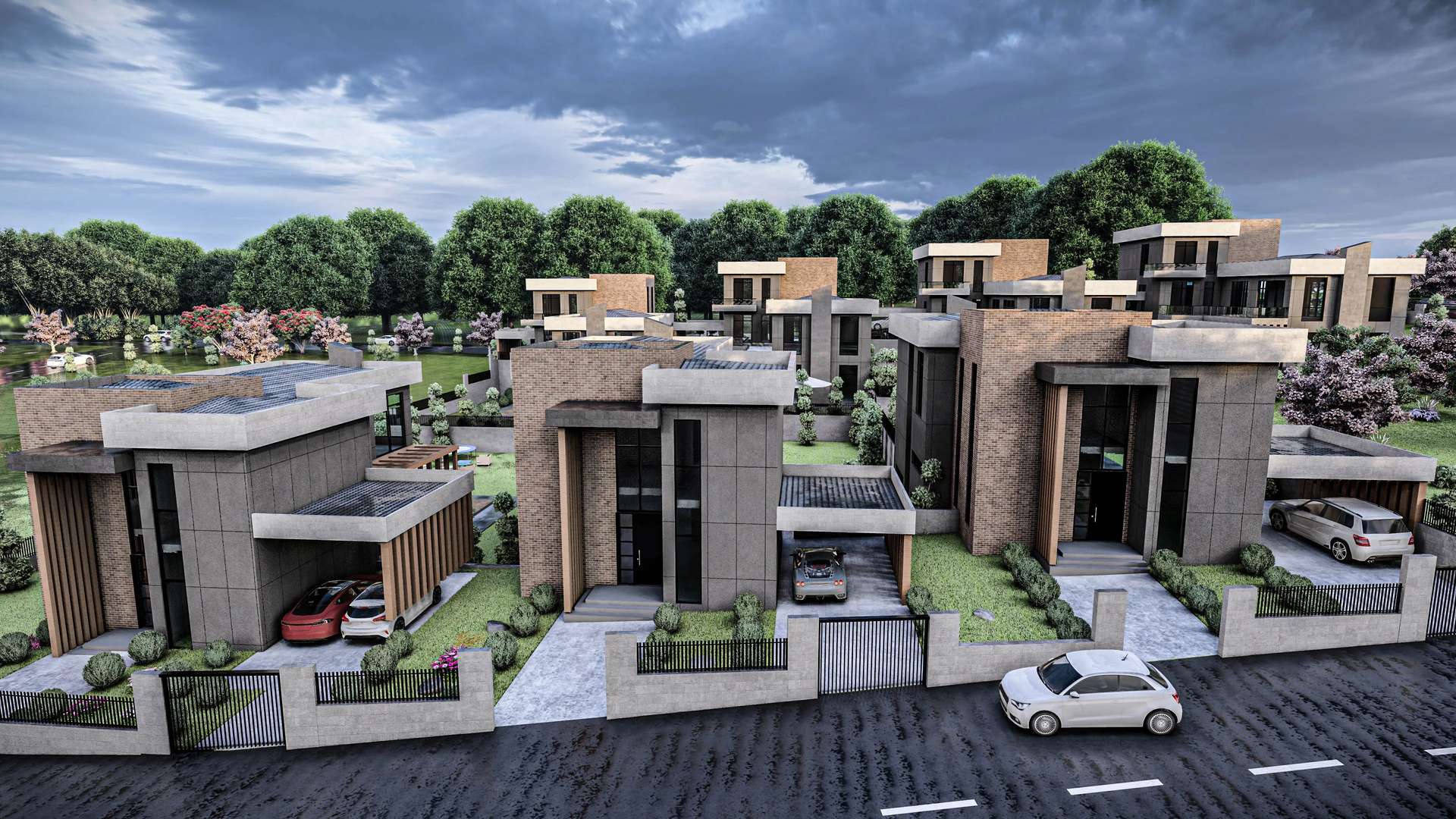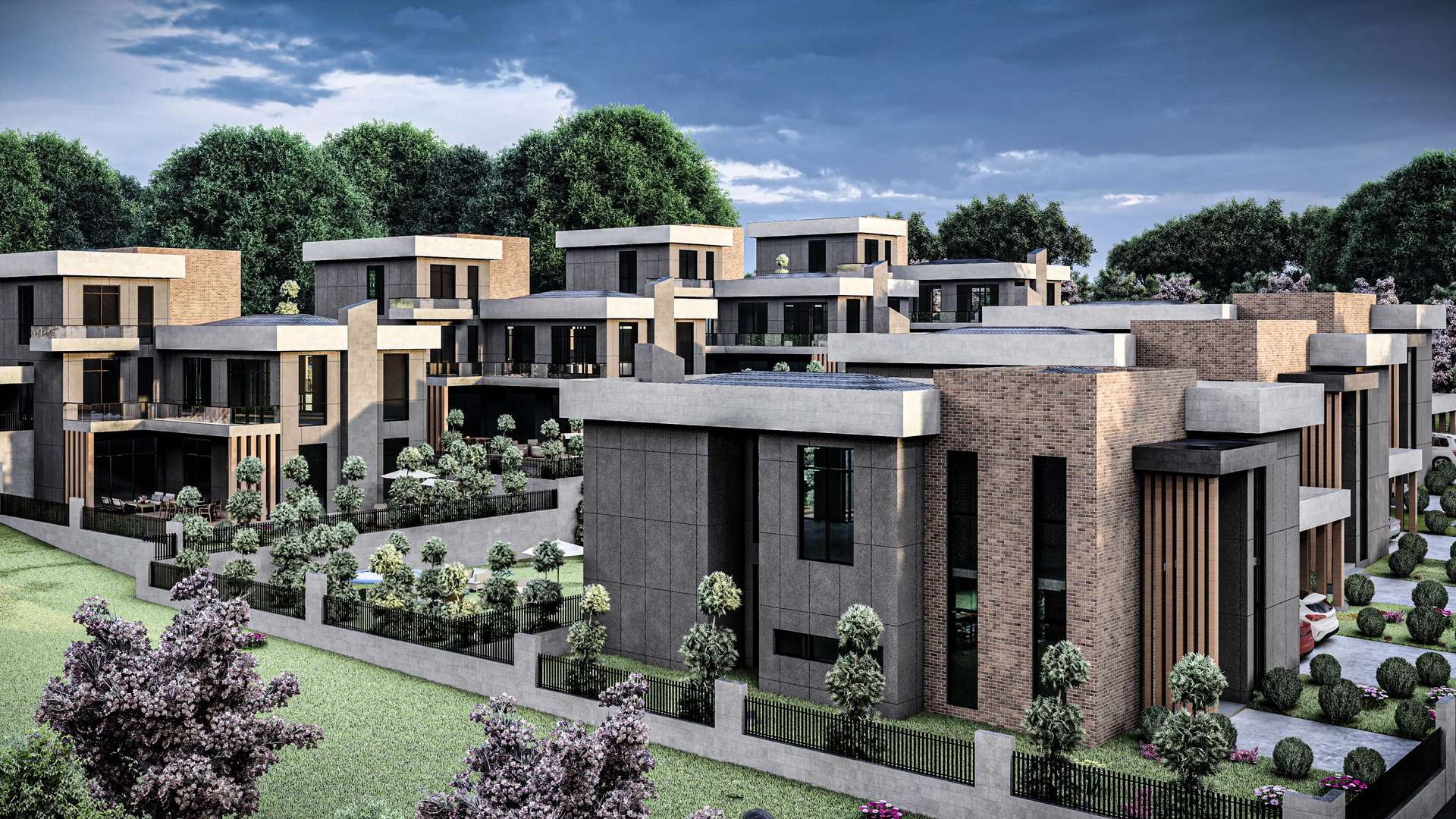 İncek’te konumlanan Venti Villaları 1. Etap projesi, modern kütle kurgusu ve nitelikli malzeme seçimleriyle müstakil yaşama prestijli bir yorum getiriyor. Rasyonel ve kübik formların hakim olduğu tasarımda, cepheleri saran antrasit yüzeyler; sıcak tuğla dokusu ve dikey ahşap güneş kırıcılarla dengelenerek yapıya estetik bir ritim kazandırmaktadır. Geniş cam yüzeyler ve galeri boşluklu yüksek giriş kurgusu, iç mekanların gün ışığıyla maksimum düzeyde bütünleşmesini sağlarken; ana kütleye entegre edilmiş yarı açık otoparklar ve korunaklı özel bahçeler fonksiyonelliği artırır. Modern hatları ve peyzajla iç içe geçen yerleşim planıyla proje, kullanıcılarına konforlu ve izole bir yaşam alanı sunmaktadır.