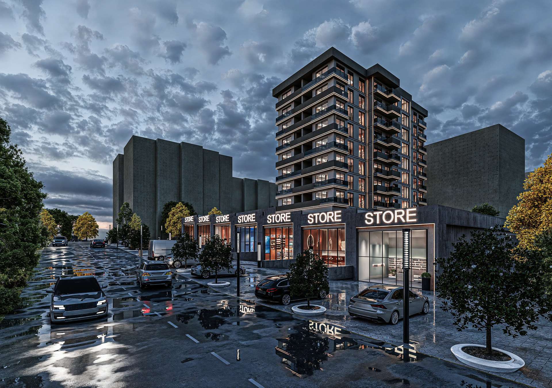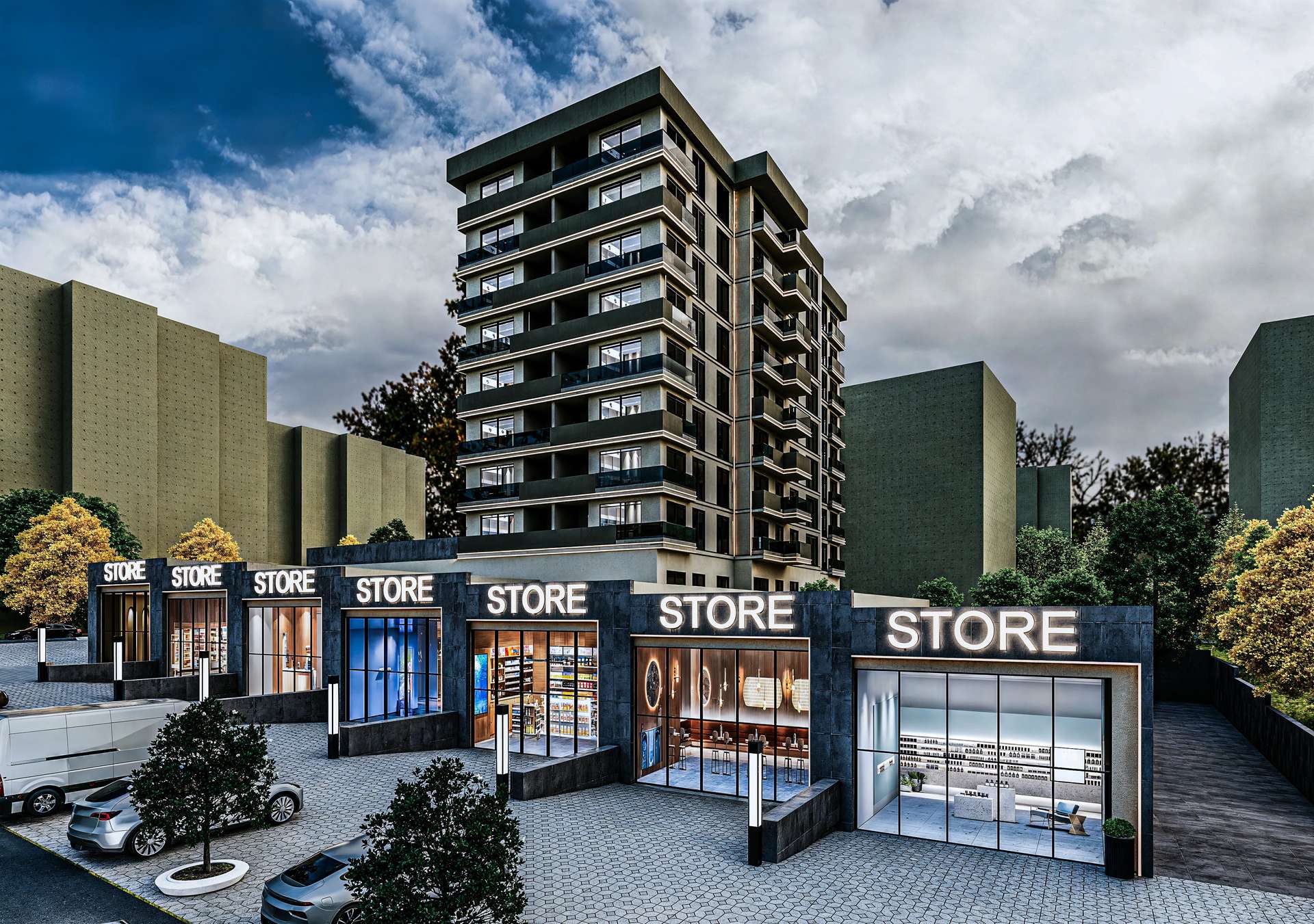 Eryaman’ın kentsel dokusuna dinamik bir soluk getiren bu karma proje, konut ve ticaret fonksiyonlarını modern bir mimari dille tek kütlede buluşturuyor. Tasarımın temelini oluşturan zemin kattaki ticari bazalar (dükkanlar), geniş cam vitrinleriyle sokağa doğrudan entegre olarak mahalleye canlılık ve kentsel bir hareket katmaktadır. Ticari alanların üzerinde yükselen konut kütlesi, cepheyi yatayda kesintisiz saran koyu antrasit kat silmeleri ve şeffaf cam balkonlarla ritmik, dengeli bir silüet oluşturur. Toprak tonlarındaki sıcak dış cephe ile modern koyu detayların yarattığı estetik tezat yapıya prestijli bir karakter kazandırır. İşlevselliğin merkeze alındığı bu tasarım, kullanıcılarına hem sosyal hem de konforlu bir kent yaşamı vadetmektedir.