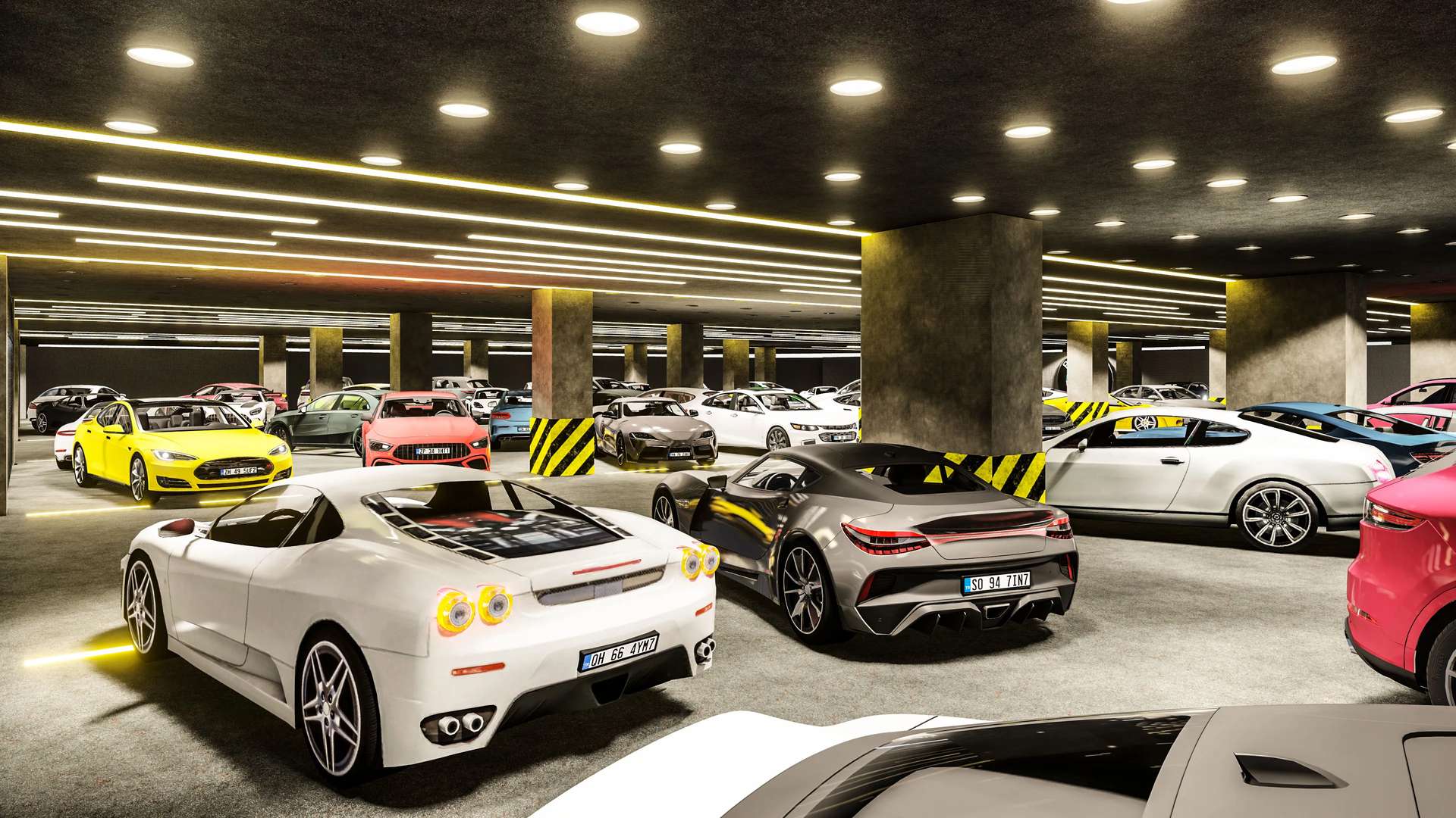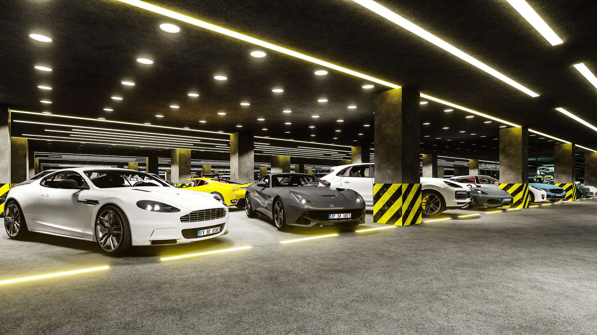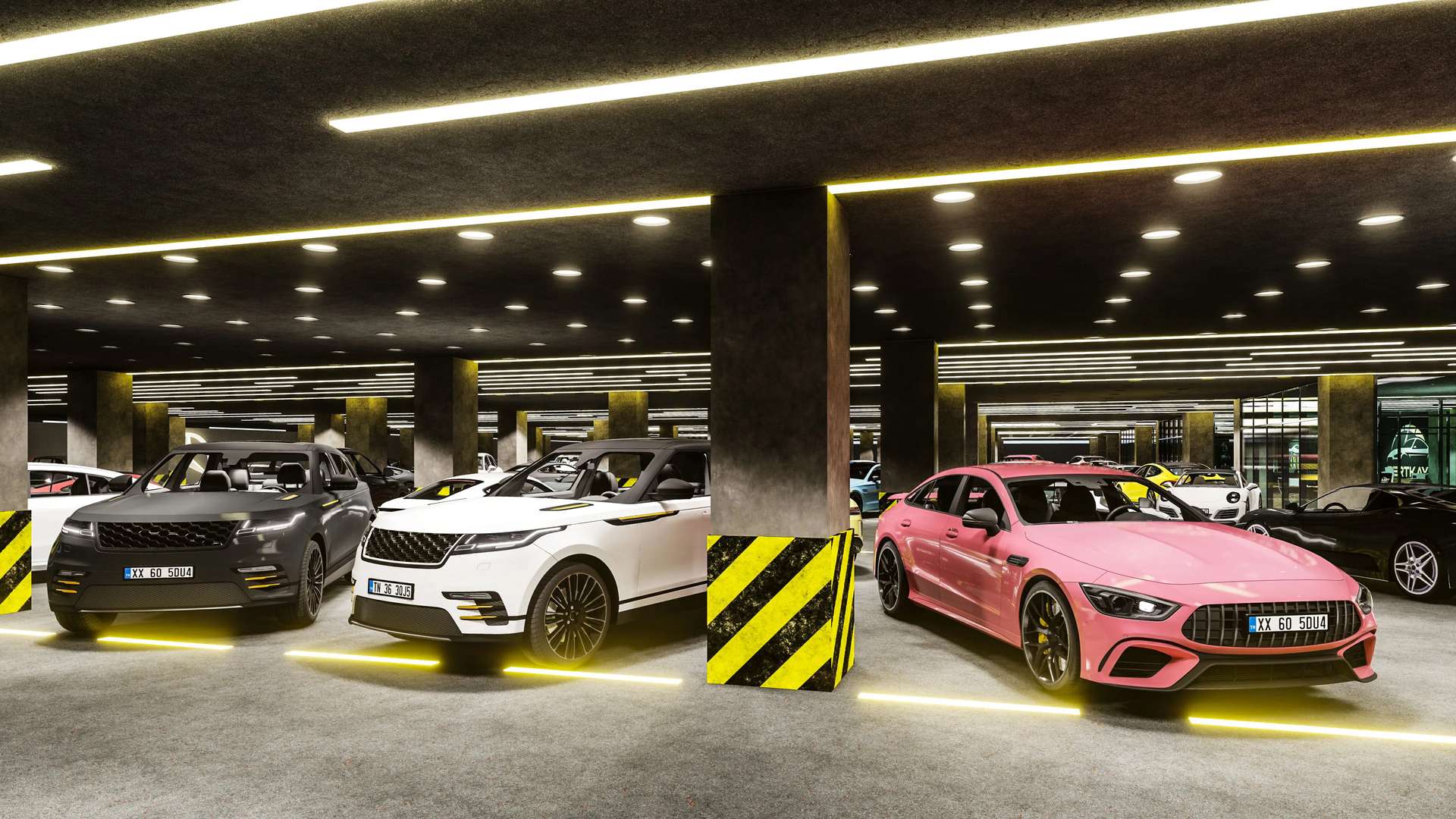 Otomotiv sektörü için özel olarak tasarlanan bu kapalı otopark ve galeri projesi, klasik bir park alanının ötesine geçerek araçlar için prestijli bir sergileme merkezi sunuyor. Brüt beton kolonlar ve koyu renkli yüzeylerin hakim olduğu endüstriyel tasarım, tavanda ve zeminde ritmik olarak uzanan lineer LED aydınlatmalarla vurgulanarak mekana dinamik, modern ve lüks bir atmosfer kazandırıyor. Zemine entegre edilen ışıklı şeritler, park alanlarını estetik bir dille tanımlarken araç sirkülasyonunu da yönlendiriyor. Galerilere özel olarak ayrılmış geniş ve aydınlık camekanlı sergileme alanları (showroomlar), markaların kurumsal kimliklerini ön plana çıkarıyor. Fonksiyonelliği yüksek standartlı bir estetikle harmanlayan bu proje, kullanıcılarına ve ziyaretçilerine üst düzey bir deneyim vadetmektedir.
