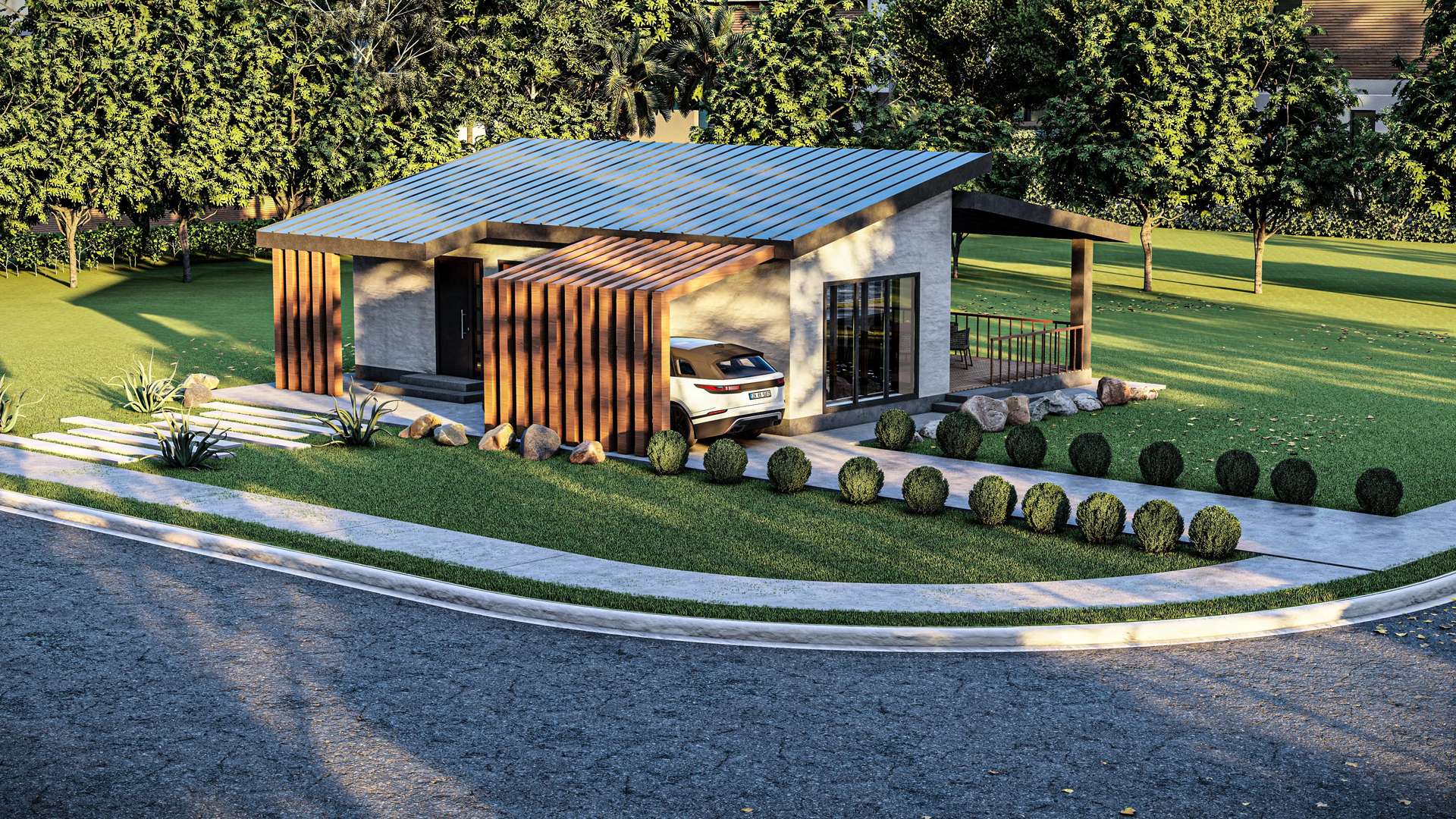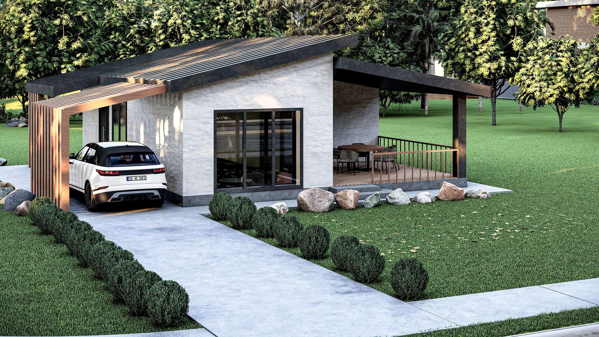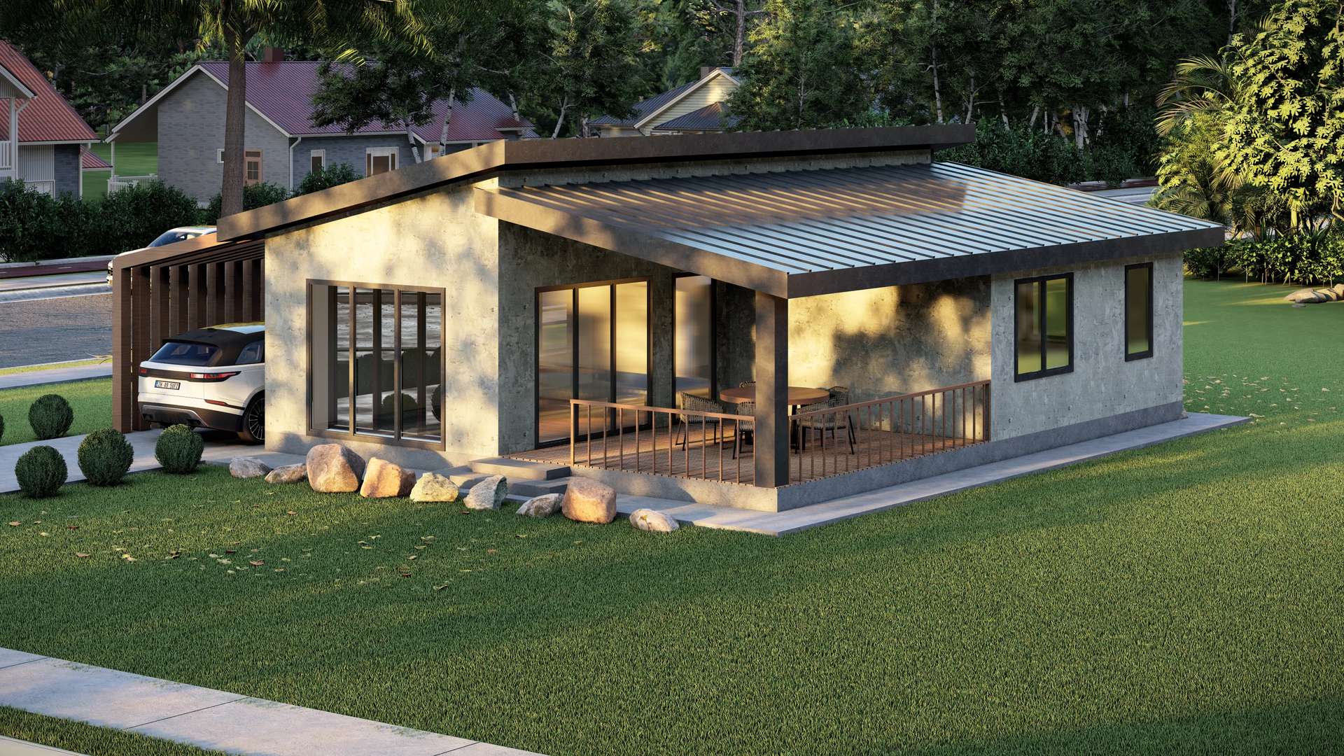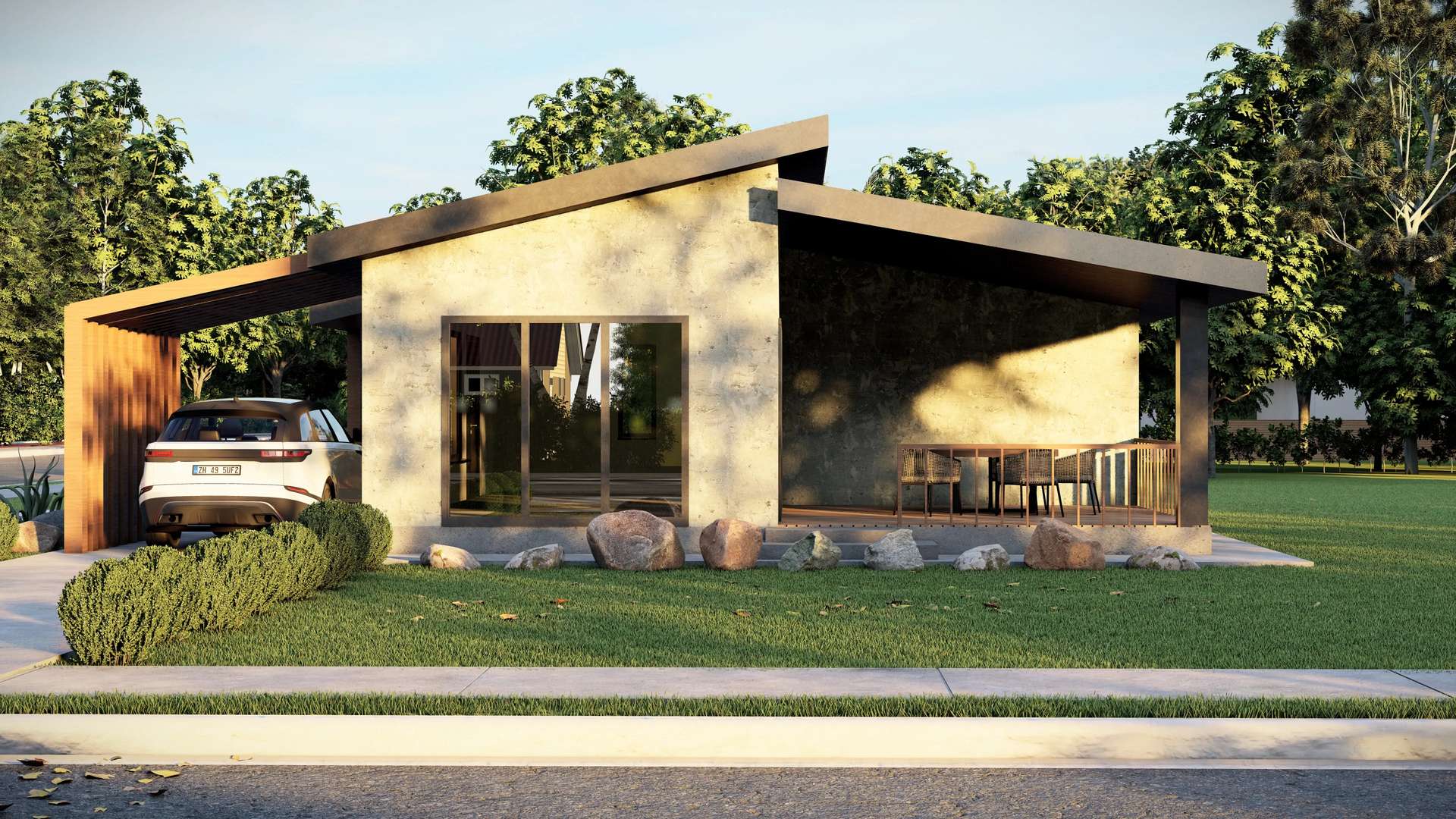 Minimalist yaşam tarzını dinamik bir kütle kurgusuyla yeniden yorumlayan hafif çelik yapı, yenilikçi formu ve fonksiyonel detaylarıyla öne çıkıyor. Tasarımın ana karakterini oluşturan tek yöne eğimli (asimetrik) çatı sistemi, yapıya çağdaş bir silüet kazandırırken iç mekanda ferah bir hacim hissi yaratmaktadır. Brüt beton görünümlü cephe yüzeyleri ve antrasit kenet çatının yarattığı endüstriyel netlik; yan cepheye entegre edilen ve dikey sıcak tonlu panellerle tanımlanan yarı açık otopark (carport) ile estetik bir şekilde dengelenmiştir. Geniş cam açıklıklarla verandaya bağlanan yaşama alanı sayesinde bu proje, kompakt ölçeğine rağmen doğayla iç içe, ferah ve prestijli bir müstakil yaşam deneyimi sunmaktadır.
