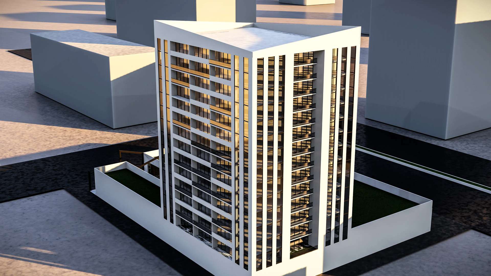 İskitler’de konumlanan bu karma kullanım projesi, dikey ve yatay kütlelerin güçlü bir mimari kontrastla bir araya geldiği modern bir tasarım anlayışına sahiptir. Zemin katta sokakla doğrudan ilişki kuran ve kentsel yaşamı canlandıran kesintisiz ticari birimler, yapının yataydaki güçlü ve davetkar bazasını oluşturur. Bu ticari bazanın üzerinde yükselen ana ofis kulesi ise rasyonel ve ritmik cephe kurgusuyla öne çıkar. Dikeyde uzanan beyaz sağır yüzeyler ile koyu renkli geniş cam panellerin yarattığı estetik kontrast, kütleye ince, zarif ve dinamik bir silüet kazandırır. Şeffaflığı merkeze alan bu yenilikçi tasarım, iç mekanlarda maksimum gün ışığı sağlarken; proje, İskitler bölgesinin dönüşen ve gelişen yüzüne prestijli bir değer katmaktadır.