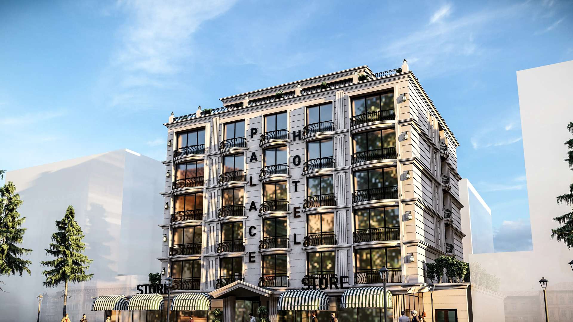 Kızılay'da konumlanan Palas Otel projesi, kentin dinamik dokusuna neoklasik mimarinin zamansız zarafetiyle değer katıyor. Simetrik ve anıtsal bir kütle kurgusuna sahip olan yapı, dikeyde yükselen klasik pilaster formlu silmeleri ve belirgin kat katmanlarıyla güçlü, prestijli bir duruş sergiliyor. Cepheyi ritmik bir şekilde bölen geniş cam yüzeyler ve ferforje detaylı zarif Fransız balkonlar, klasik oranları modern konforla buluşturarak iç mekanlara maksimum gün ışığı ve ferahlık kazandırır. Zemin katta yer alan ve şık çizgili tentelerle tanımlanan ticari birimler sokağın enerjisine doğrudan uyum sağlarken, çatı terası misafirlere izole bir dinlenme alanı sunar. Geleneksel estetiği çağdaş otelcilik anlayışıyla harmanlayan bu tasarım, kullanıcılarına ayrıcalıklı bir konaklama deneyimi vadetmektedir.