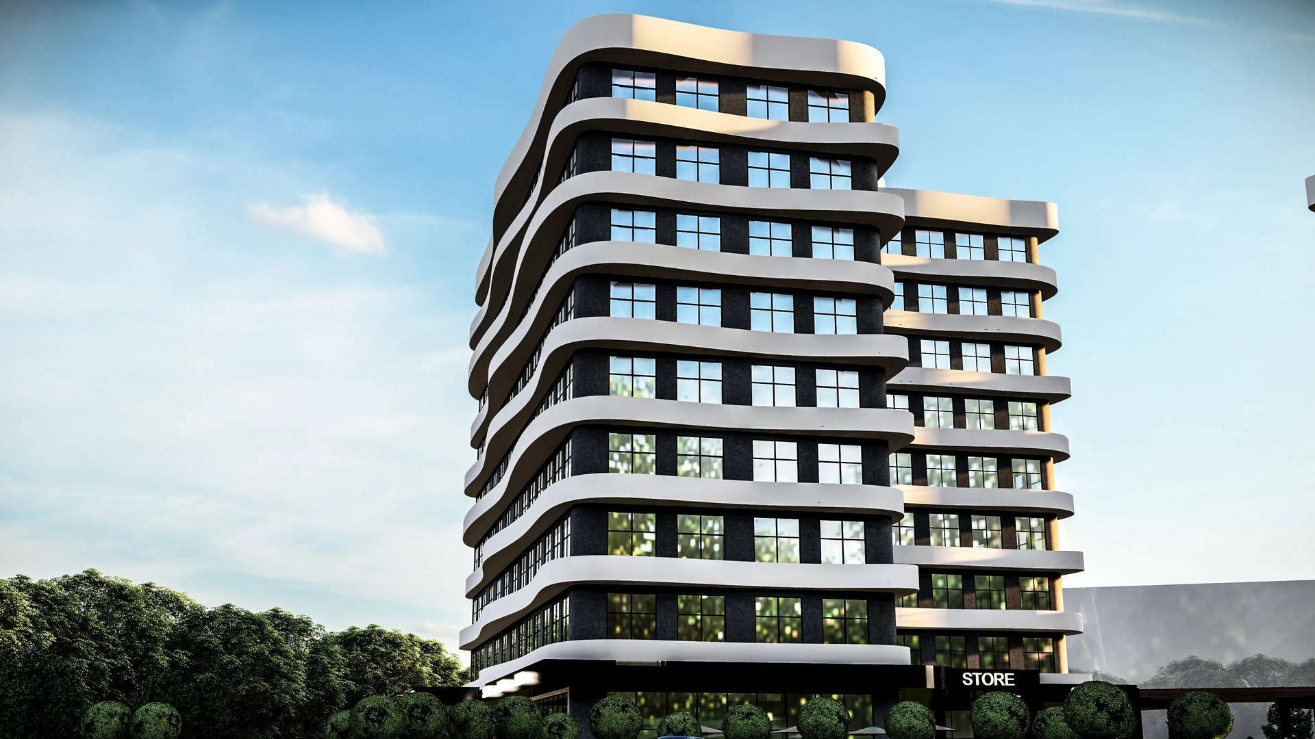 Ticari ve ofis fonksiyonlarını modern bir mimari dille birleştiren Lodumu İş Merkezi, kullanıcı odaklı ve dinamik bir kütle kurgusuna sahiptir. Cephe boyunca uzanan dalgalı beyaz yatay bantlar, geniş cam yüzeylerle güçlü bir kontrast yaratarak yapıya heykelsi bir akıcılık kazandırır. İki ofis bloğunun merkezinde kurgulanan açık avlu, geometrik su öğesi ve zemin kattaki ticari birimlerle desteklenerek nefes alan bir toplanma alanı oluşturur. Sokağı içeri davet eden geçirgen zemin katı ve rasyonel planlamasıyla proje, kentin ticari yaşamına prestijli ve yenilikçi bir odak noktası sunmaktadır.