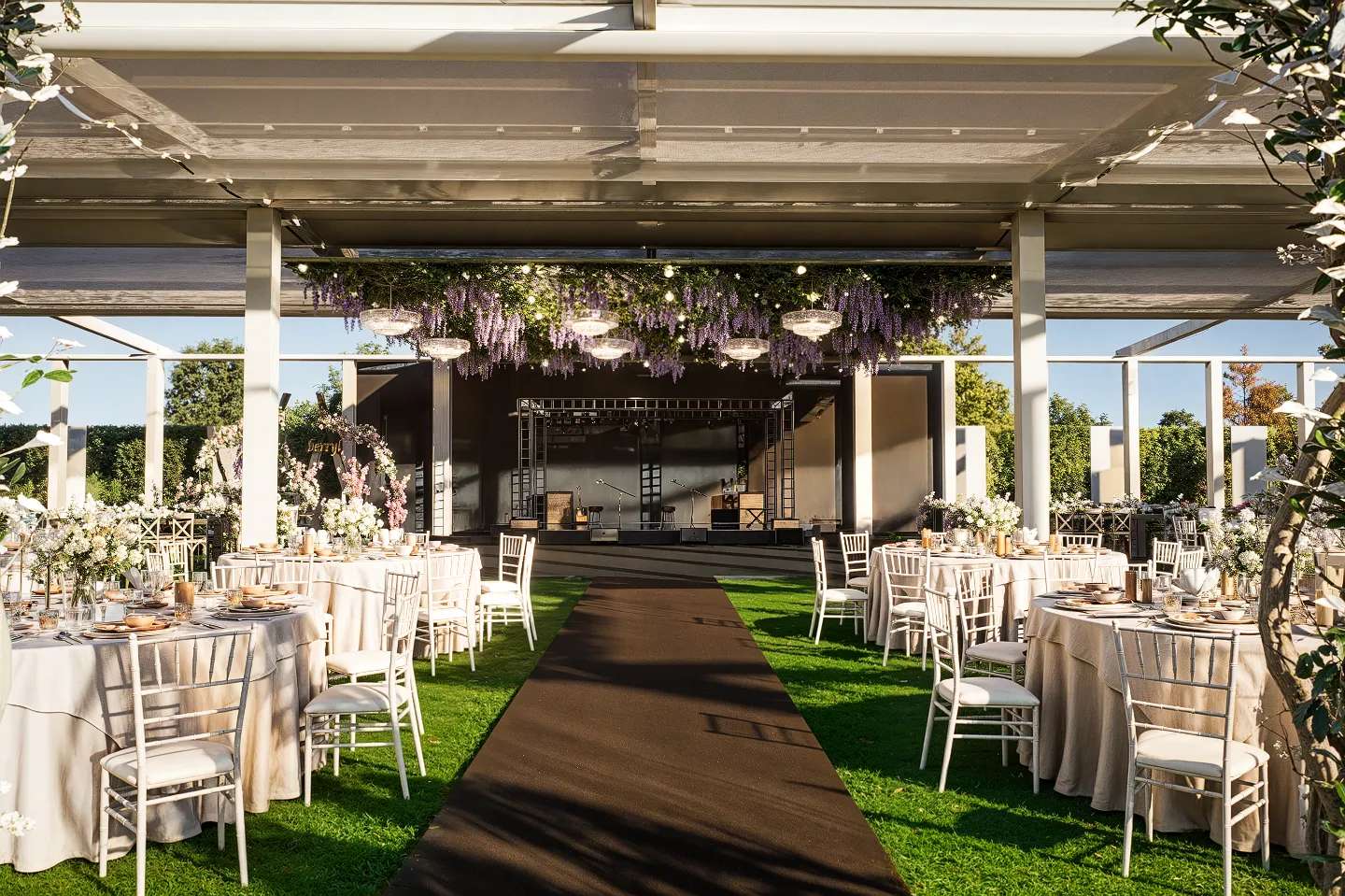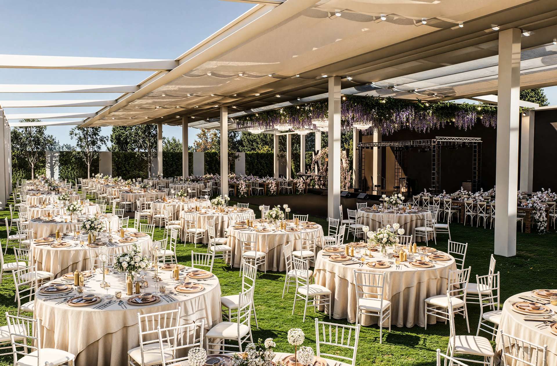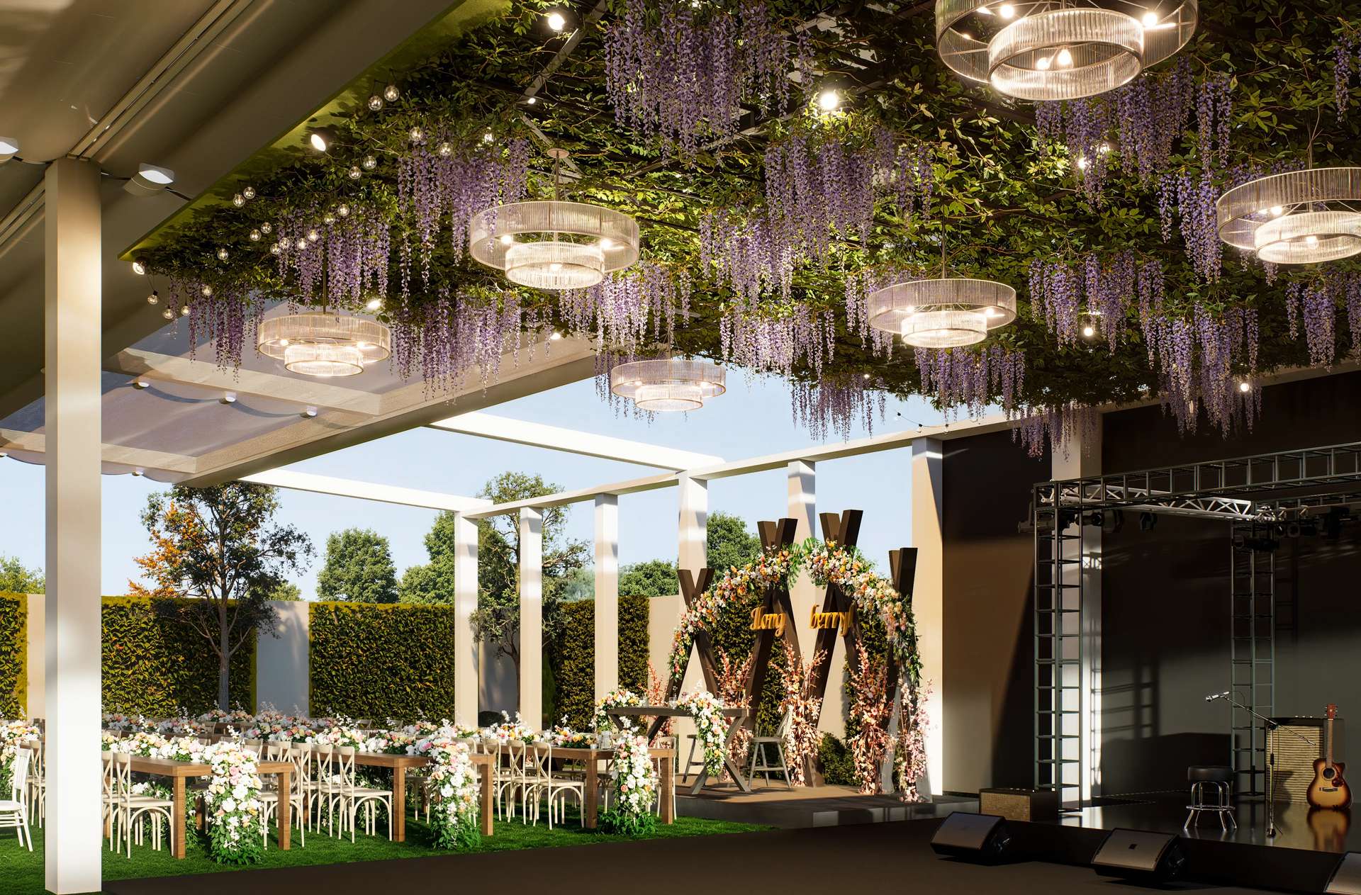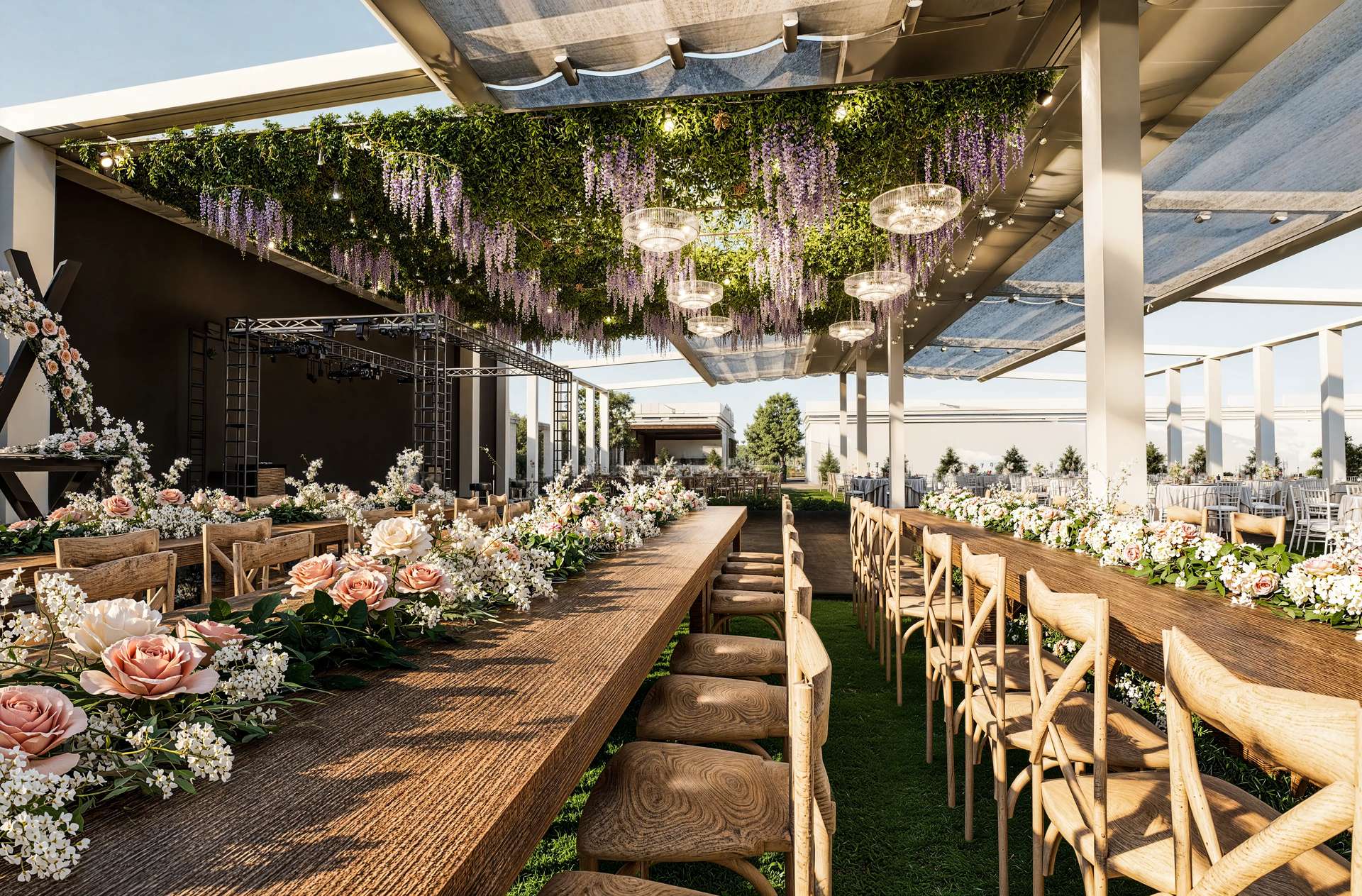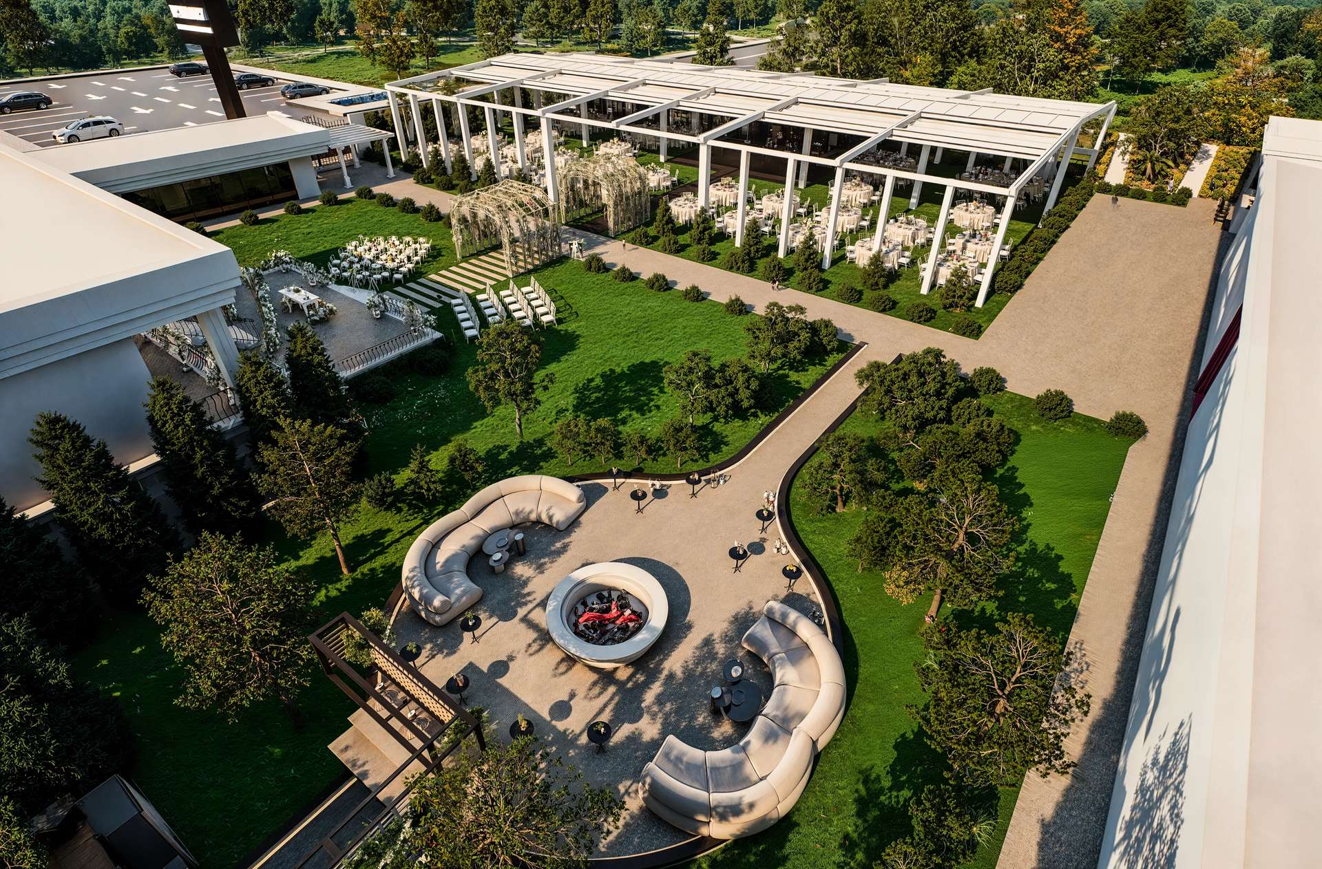Gölbaşı’nın doğal güzellikleriyle bütünleşen Rosemary Garden Wedding Hall, açık hava etkinlik alanlarını neoklasik mimarinin zarafetiyle yeniden tanımlıyor. Tasarımın odak noktasında yer alan ana yapı, beyaz renkli pürüzsüz cephesi, klasik kolonları ve zarif ferforje detaylarıyla kutlamalara prestijli bir arka plan sunmaktadır. Geniş teras kurgusu, mekanı çevreleyen özenli peyzaj ve heykelsi ağaçlarla kusursuz bir görsel uyum yakalar. Yarı açık davet alanı ise modern çatı örtüsü ve beyaz yapısal iskeletiyle doğayla iç içe, ferah bir atmosfer yaratır. Tavanı süsleyen şık avizeler ve sarkan bitki detayları, rasyonel mimari hatlara romantik bir dokunuş katmaktadır. Fonksiyonelliği lüksle harmanlayan bu proje, misafirlerine Gölbaşı'nda unutulmaz ve seçkin bir organizasyon deneyimi vadetmektedir.