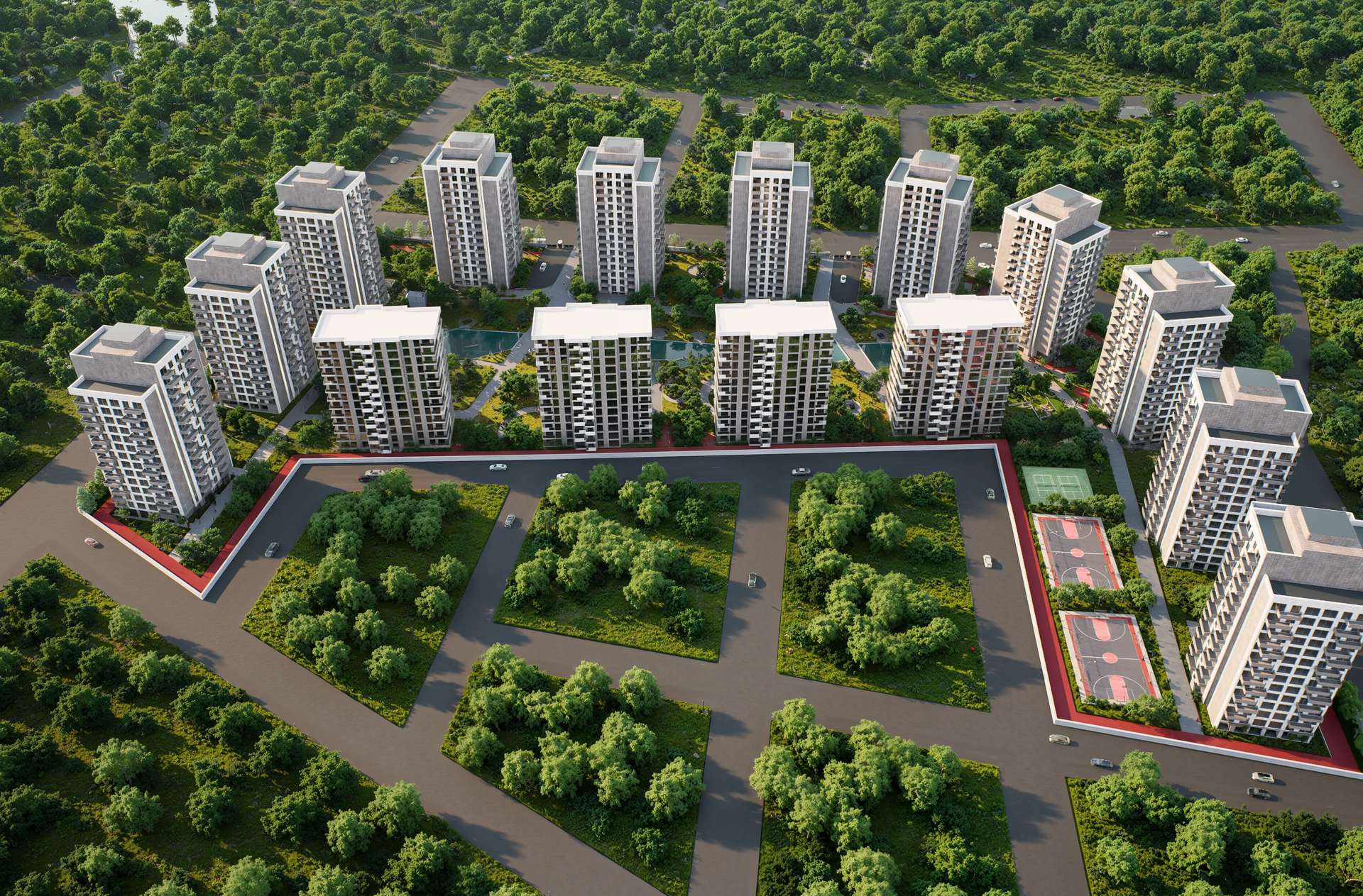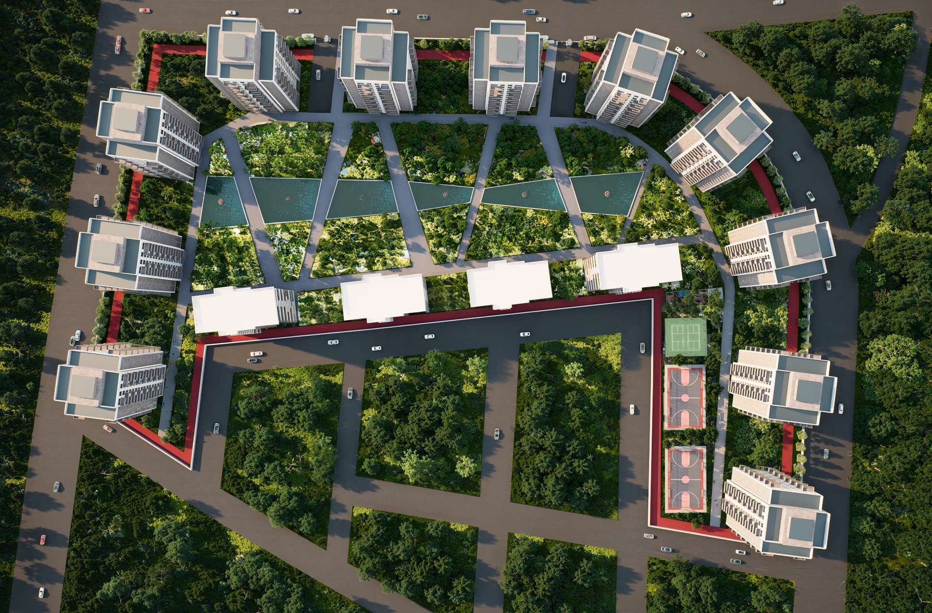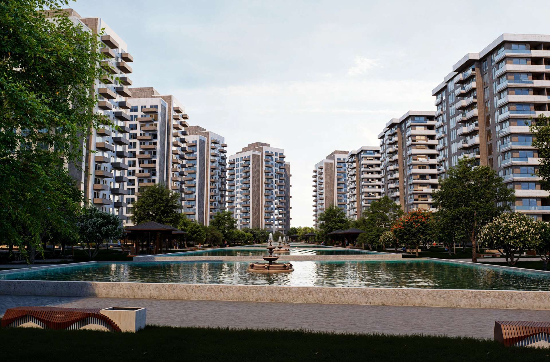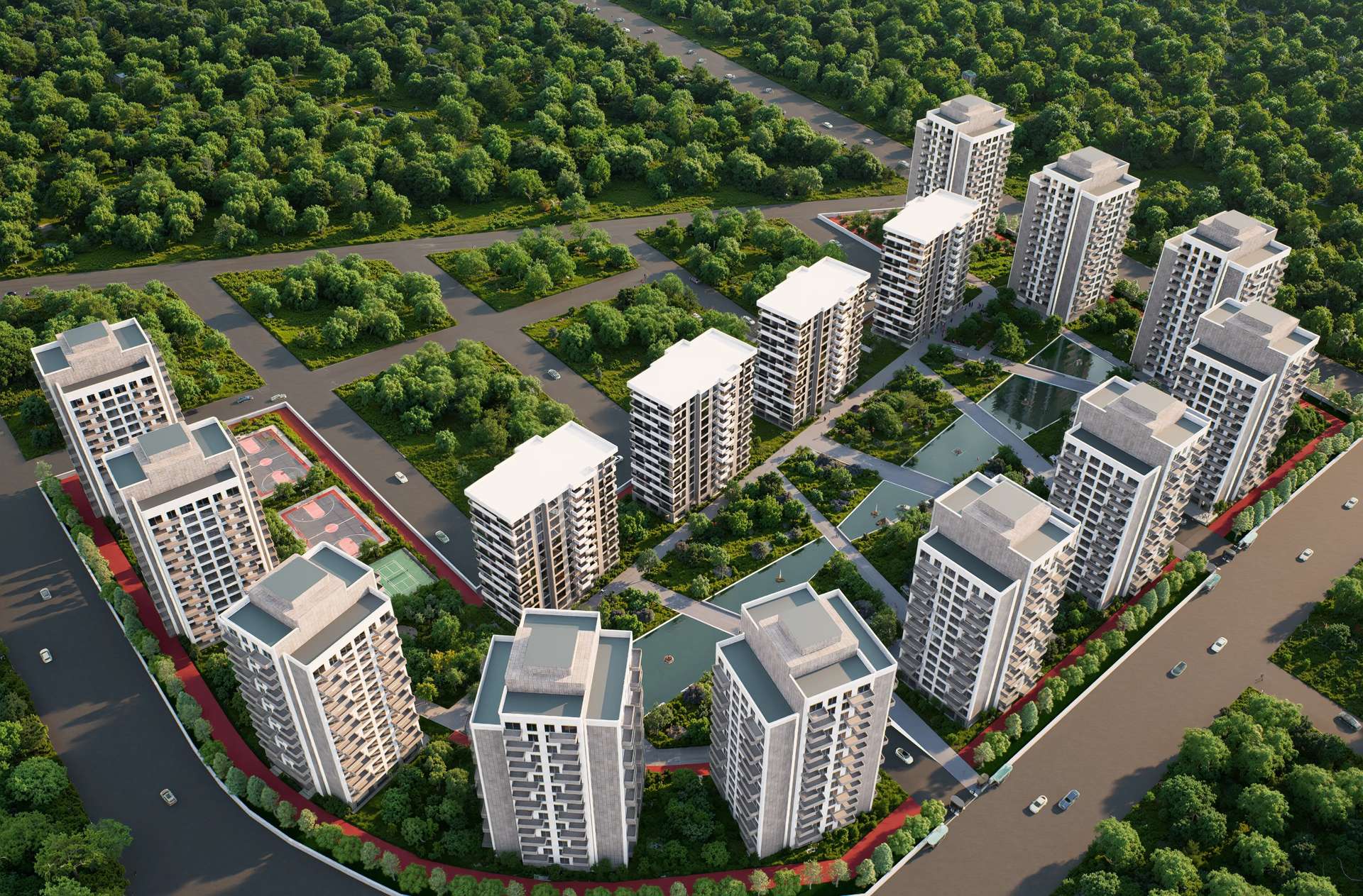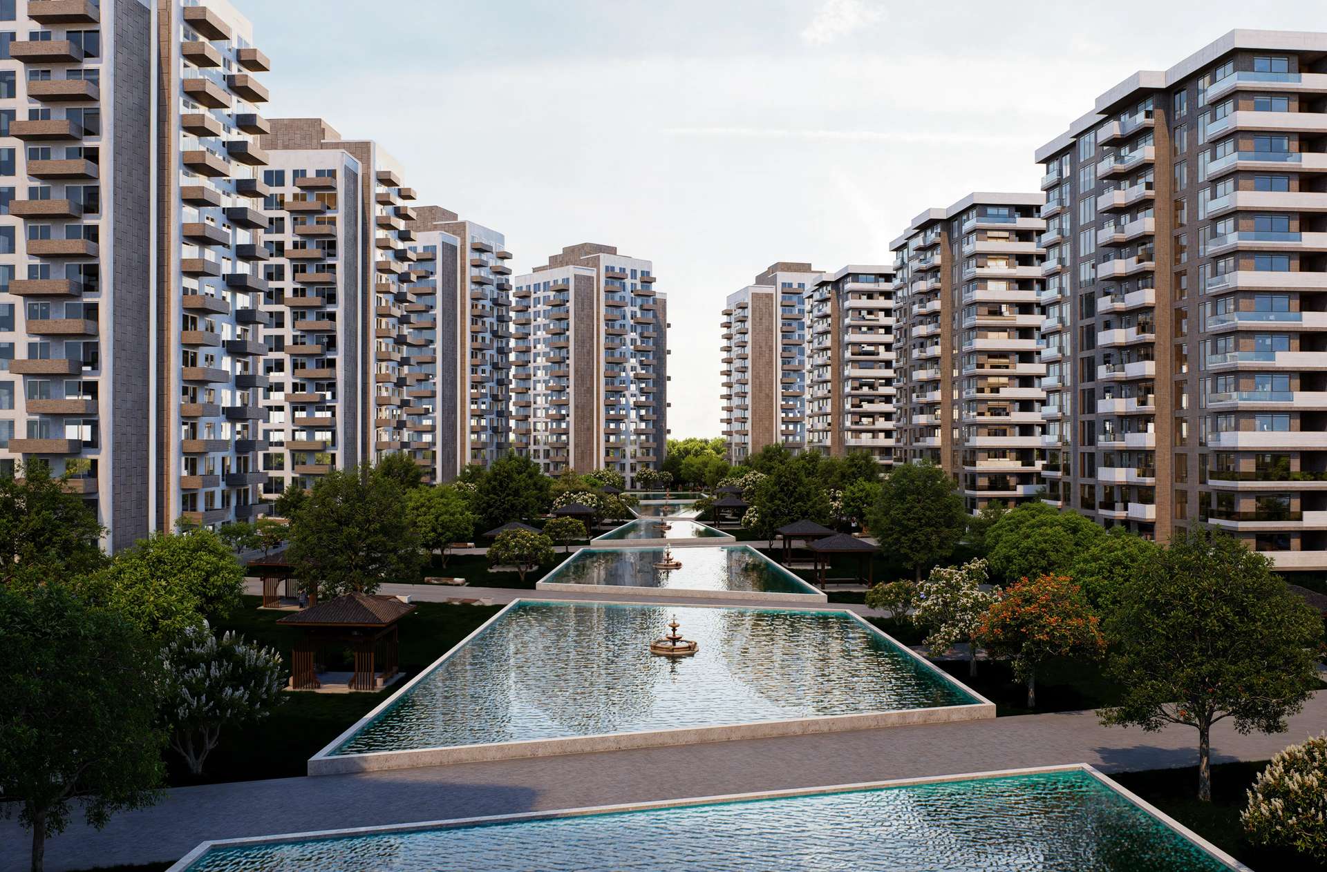 Geniş ölçekli bir konut projesi olarak tasarlanan Varlık Sitesi, yüksek katlı blokların kent ölçeğindeki ritmini zengin bir peyzaj kurgusuyla dengeliyor. Birbiriyle uyumlu rasyonel kütleler dikeyde yükselirken; cephedeki hareketli balkon çıkmaları ve dokulu yüzey kontrastları kulelere monotonluktan uzak, dinamik bir silüet kazandırıyor. Projenin kalbinde yer alan ve bloklar tarafından korunaklı bir çanak gibi sarılan geniş iç avlu, tasarımın ana odak noktasını oluşturmaktadır. Uzun akslar boyunca uzanan yansıma havuzları, simetrik peyzaj ögeleri ve ahşap pergolalar, sakinlerine şehrin içinde nefes alan dingin bir mikro-kent ortamı sunar. Yapısal yoğunluğu suyun ve doğanın dinginliğiyle harmanlayan proje, bölgesinde güçlü ve prestijli bir yaşam merkezi vadetmektedir.
