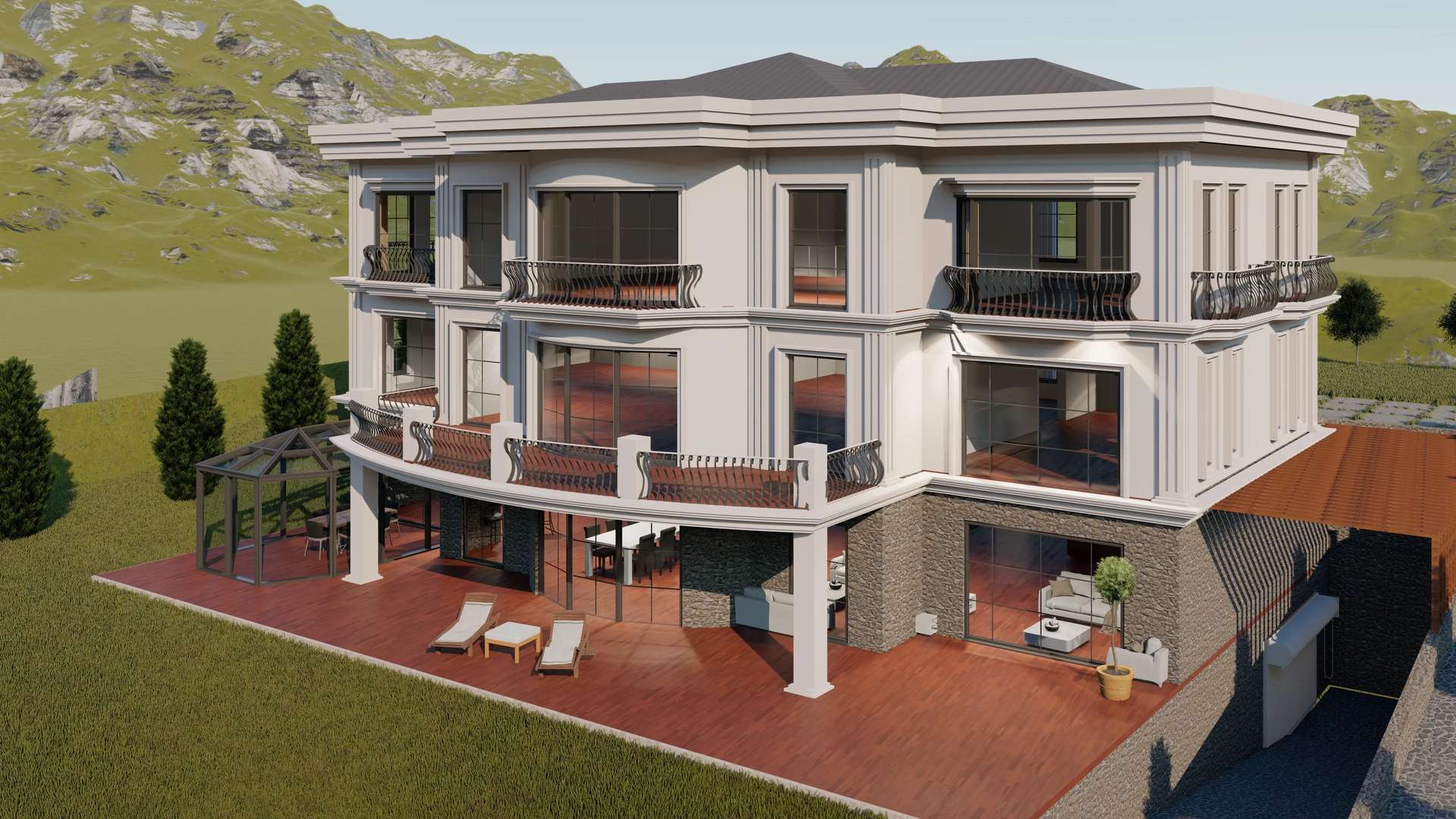 Neoklasik mimarinin zarafetini modern yaşamın konforuyla buluşturan bu konsept tasarım, asil ve zamansız bir duruş sergiliyor. Cepheye karakter kazandıran klasik pilaster kolonlar, belirgin kat silmeleri ve zarif kavisli ferforje korkuluklar, yapının prestijli kimliğini vurgulayan ana unsurlar olarak öne çıkmaktadır. Doğal taş kaplamalı sağlam bir baza üzerinde yükselen kütle, geniş izleme terasıyla dış mekan kullanımını maksimize eder. Alt kotta peyzaja entegre edilen şeffaf kış bahçesi dört mevsim doğayla iç içe bir yaşam sunarken, geniş pencere açıklıkları klasik oranlara çağdaş bir ferahlık katar. Geleneksel estetiği lüks detaylarla harmanlayan proje, kullanıcılarına gösterişli ve ayrıcalıklı bir müstakil yaşam vadetmektedir.